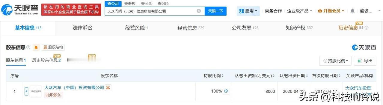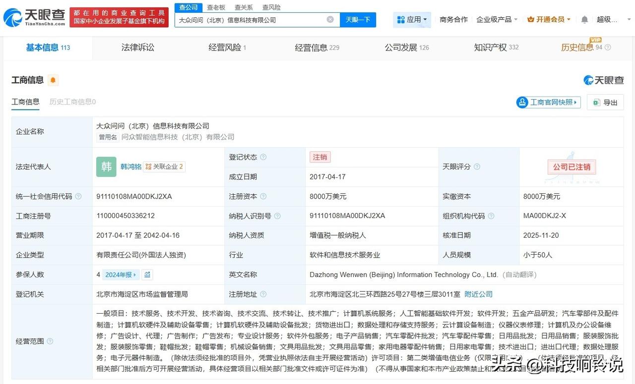 【大众汽车旗下问问信息科技公司注销】 天眼查App显示,近日,大众问问(北京)信息科技有限公司登记状态由存续变更为注销。此前,该公司已发布注销备案公告。 该公司成立于2017年4月,法定代表人为韩鸿铭,注册资本8000万美元,经营范围包括人工智能基础软件开发、汽车零部件及配件制造、数据处理和存储支持服务、电子元器件制造等。股东信息显示,该公司由大众汽车(中国)投资有限公司全资持股。 天眼查信息: