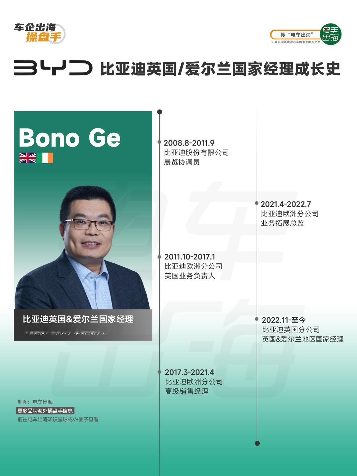 Bono Ge,这个名字在比亚迪英国 /爱尔兰这片战场其实特别重要。他既是“信得过的本地高管”,也是一个华人管理者,在中英之间架起了一条战略桥梁。 从他履历图看,他在比亚迪已有非常深的历史。当年他就做展览协调,从基层起步;后来他负责比亚迪欧洲业务、英国市场多年。这样的经历,意味着他非常熟悉英国本地客户、渠道、经销商的运作方式。 更有意思的是,他既懂中国品牌的DNA,也明白西方市场的节奏。作为华人高管,他能够把比亚迪“中式创新 +性价比优势”翻译成英国消费者听得懂、愿意买的语言。而对比亚迪内部而言,他又是一个可靠的落地将领:中英双文化,下沉能力强。 自 2022 年 11 月起担任英国 & 爱尔兰国家经理,他正站在比亚迪欧洲扩张的重要前线。眼下比亚迪在英国的销量正在突飞猛进,门店铺设加速,本地品牌认知也在升级。