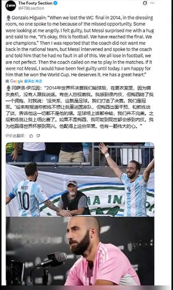 伊瓜因:2014世界杯决赛后都没人跟我说话,只有梅西给我一个拥抱