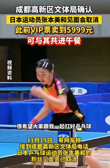 取消太硬气!放弃中国国籍加入日本的张本美和,想来成都开见面会卖5999元天价门票捞金,真把咱们这儿当冤大头了? 一张天价门票的泡沫破灭,仅仅用了八天。 11月19号,成都高新区文体局的一通确认电话,把那个叫价5999元的“粉丝见面会”彻底按下了暂停键。 这场原本要在12月8日登场的商业秀,还没开场就因为这离谱的“吃相”被舆论掀了桌子。 不得不说,这一刀切得确实大快人心。 毕竟在我们体育圈,真正的奥运冠军、大满贯选手办活动,哪怕是国乒那几位顶流,要是收费也就是一两千块顶天了,以前马龙、丁宁他们搞见面会甚至常常是为了公益或者是免费回馈球迷。 反观张本美和,一个年仅17岁、手里还攥不出个世界冠军头衔的年轻选手,一来就要收个近六千块的入场费,这哪里是想搞体育交流,分明是拿着还没打响的名气在试探市场的智商底线。 更有意思的是这近六千块钱买来的是什么。 按照早前流出的那张已被连夜删光的宣传单来看,那个只有10个名额的VIP待遇,也就是能在饭桌上共进一次午餐,再加上40秒的专属签名时间和一张单独合影。 最让懂球的粉丝哭笑不得的是那个所谓的“一对一打球”,原本大家以为是硬碰硬的技术切磋,结果核实下来竟然只是单纯喂三个球让粉丝接一下,外带五分钟“握拍姿势”级别的指导。 这甚至不如花几十块钱去球馆请个教练实在。 商家想赚钱可以理解,但这如意算盘打得也太把情感当儿戏了。 这孩子今年夏天刚加盟成都高新若水居俱乐部,打联赛的时候迟到不说,头两轮连场都没上,这种“打酱油”的表现还没凉透,俱乐部倒是急着在11月11号搞宣发想趁热捞金。 他们显然是把“四川祖籍”当成了最大的卖点,以为这就足够让本地粉丝掏腰包。 可问题就在这“身份”二字上。 张本美和与她哥哥一样,早已入籍日本,她的父亲张本宇早年间那句“要带领日本队打败中国队”的言论,至今还在很多老球迷心里扎着刺。 这边陈幸同、林高远们在赛场拼杀,甚至像陈熠这样刚刚在法国孤军奋战拿了女单冠军的国手都低调得很,那边一个归化日本、立志在竞技场上赢中国的选手,转身就要回祖籍地用高出市场几倍的价格搞“情感变现”,这让谁心里能舒服? 俱乐部这次的操作确实有点像个蹩脚的笑话。 面对铺天盖地的质疑,最初还要硬着头皮解释什么“互动环节特殊”,结果一看风向不对,连夜就把社交平台上的购票链接和海报删得干干净净,仿佛一切都没发生过。 但这种“悄悄进村,打枪不要”的掩耳盗铃,反而更激起了反感。 现在正好是混合团体世界杯开赛前夕,张本美和原本还要在11月30日开始的那周里代表日本队在成都比赛。 如果不取消,很难想象到时候那种“台上是对手,台下是摇钱树”的割裂感会引发什么样的情绪风波。 公众从来不排斥体育交流,也欢迎凭本事吃饭的职业运动员,但不管是“归来”还是“做客”,诚意和尊重才是入场券。 这回叫停,不仅是给不把球迷当回事的商业行为上了一课,也是给那条无论怎么变都不该被模糊的底线,重新描了个边。 信息来源:南京晨报2025-11-19发布:成都高新区文体局确认运动员张本美和见面会取消,此前VIP票卖到5999元,可与其共进午餐