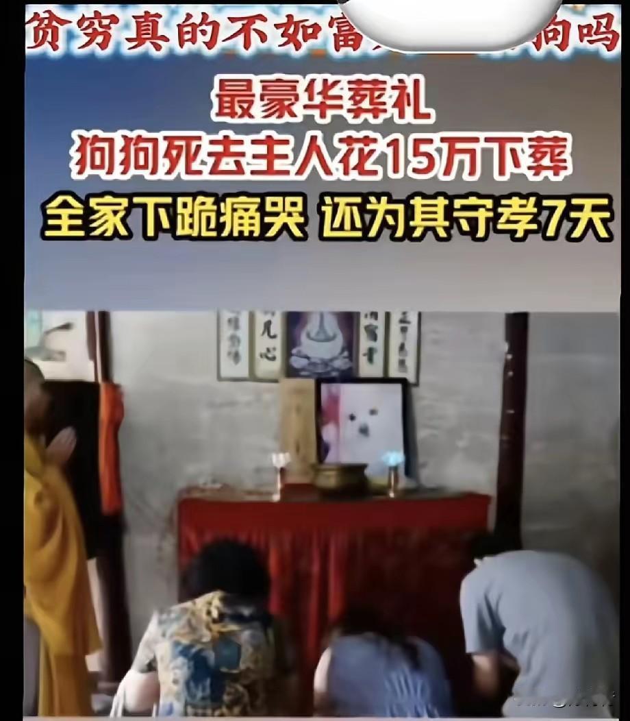 小狗死了,家人挨个下跪痛哭流涕。办狗葬花去15万元,比人去世办的都隆重。人死如灯灭,何况是动物呢,有这个必要吗? 有的说,“你没有养过狗,多年的陪伴融入真感情,狗突然离世和失去家人一样的道理。人家是把狗当成家庭的一份子了。” “这个有点过分了,狗死了大哭一场未尝不可,因为你深爱着狗。一家人跪拜失去生命的狗,实在不妥。跪天跪地跪父母,跪拜畜牲小狗,天大的笑话。” “给狗办葬礼花费15万元,这家人来钱太容易了,这钱肯定不是地里刨食得来的,建议查一查钱的来路。” “理解不了富人的想法,花重金办狗葬礼,吃饱撑的,真不如拿钱做公益有意义。” 你对为小狗办葬礼花掉15万,家人跪拜小狗看法如何?