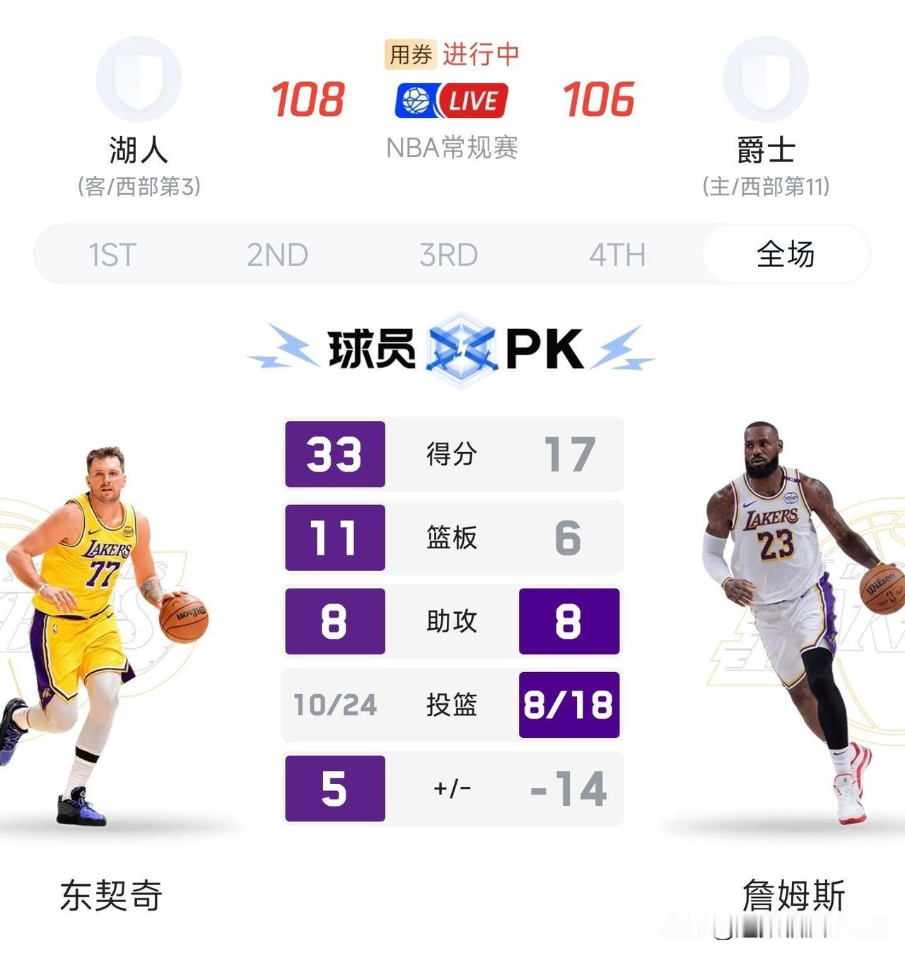 东契奇33+11+8,詹姆斯17+6+8,湖人108:106险胜爵士。 比赛只剩3分钟时湖人还领先11分,以为手到擒来的比赛硬是打出了悬念,湖人是真给机会,可是爵士未能抓住最后一投扳平比分,以2分之差遗憾输球。 东契奇砍下33分11篮板8助的“大号三双”,正负值+5,詹姆斯得到17分6板8助,但正负值-14,全队最低。这是詹姆斯本赛季的第二场比赛,教练组得研究与詹姆斯的阵容搭配了,球队虽然赢球但他对球队的贡献不大,一旦与强队交手或到了季后赛,这问题会被针对,对球队十分不利。 随着湖人战胜爵士,马刺不敌太阳,湖人排名升至西部第二,祝贺湖人!