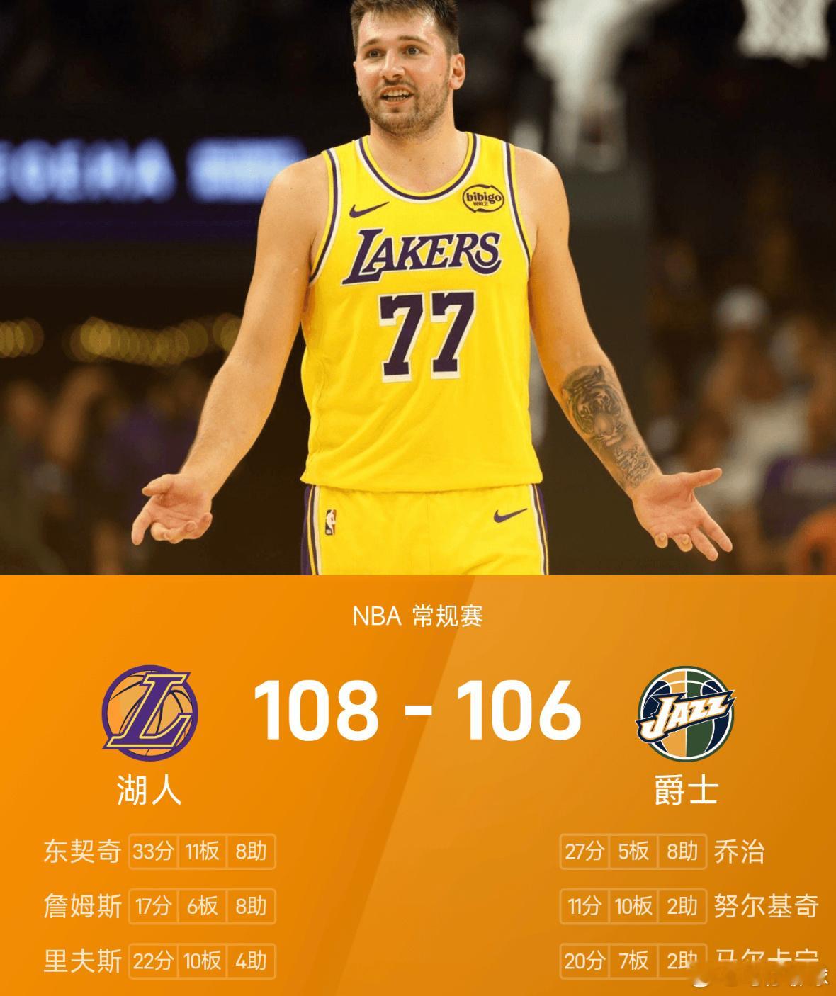 11月24日讯 25/26赛季NBA 常规赛,爵士对阵湖人。双方全场战罢,爵士106-108不敌湖人。东契奇砍下全场最高的33分11板8助,率领湖人成功取胜。