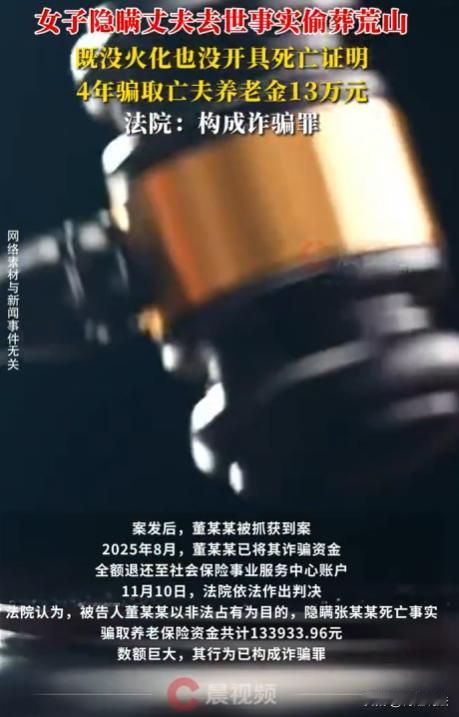 内蒙古,丈夫去世后,妻子不走寻常路,不火葬、不开死亡证明,还把丈夫葬在荒山,隐瞒死亡信息,偷偷继续领退休金,3年下来竟领了13万多。这事儿最终还是暴露了,妻子被抓后退了钱,检察院以诈骗罪提起公诉,法院也做出了判决。 丈夫张某活着时每月能领退休金,不用为生活开销和医疗费用向子女伸手,日子过得很滋润。 可2017年12月,张某去世了,妻子董某虽伤心,却打起了歪主意,她没把丈夫火化,也没开死亡证明,而是悄悄把丈夫葬在荒山,想以此隐瞒丈夫死讯,继续领退休金。 这事,听起来就让人觉得不可思议,一个家庭,本应相互扶持,在亲人离世后,本应坦然面对,妥善处理后事。 可董某却为了那点退休金,走上了违法犯罪的道路,她以为自己做得天衣无缝,可纸终究包不住火。 从2018年到2021年,这三年时间里,董某就像没事人一样,每个月按时去领丈夫的退休金,一共冒领了133933.96元。 她拿着这些钱,心里还在暗自得意,觉得自己找到了一个赚钱的好办法。 可她不知道,她的行为已经触犯了法律,等待她的将是法律的严惩。 三年后,董某的违法行为终于暴露了。 当民警找上门来的时候,她才如梦初醒,后悔不已。 她退还了全部钱款,还认罪认罚,希望能得到法律的从轻处理。 可法律是公正的,不会因为她的后悔就轻易放过她。 董某的行为,到底触犯了哪条法律呢? 根据《刑法》规定,诈骗罪是指以非法占有为目的,用虚构事实或者隐瞒真相的方法,骗取数额较大的公私财物的行为。 董某隐瞒丈夫死亡的事实,继续领取退休金,这就是典型的虚构事实、隐瞒真相。 她以为自己做得隐蔽,可实际上,她的行为已经构成了诈骗罪。 《保险法》有明确规定,参保人死亡后,其领取养老金的资格就终止了。 家属可以领取参保人的个人账户余额、丧葬补助金和抚恤金,但绝对不能继续领取退休金。 董某冒领的这13万多退休金,数额巨大,已经达到了诈骗罪的立案标准。 董某已经退还了全部钱款,还认罪认罚,是不是就可以从轻处罚了呢? 这确实是一个需要考虑的因素,根据《刑法》规定,犯罪嫌疑人如实供述自己罪行、积极退赃、认罪认罚的,可以从宽处理。 董某在被抓后,确实做到了这些,在判决时可以考虑了这些因素。 但是,从宽处理,并不意味着可以免除处罚。 董某的行为,除了诈骗罪,还会不会涉及其他法律责任呢? 根据《殡葬管理条例》的规定,办理丧事活动,不得妨害公共秩序、危害公共安全,不得侵害他人的合法权益。 董某没有火化丈夫,而是选择葬在荒山,虽然这可能出于个人原因,但如果因此造成了环境污染或者其他危害,就可能违反殡葬管理条例。 不过,在这个案子里,董某的主要违法行为还是冒领退休金,所以,在判决时,应该主要考虑的是诈骗罪。 关于死亡证明,这也是一个重要的环节。 死亡证明,是证明一个人已经死亡的法律文件,对于办理后续事宜非常重要。 董某没有开死亡证明,这不仅影响了她自己领取丧葬补助金和抚恤金,也可能给其他家属带来不必要的麻烦。 不过,这并不影响她诈骗罪的成立。 最终,法院判决董某犯诈骗罪,判处有期徒刑三年,缓刑四年,并处罚金15000元。 法律是公正的,它不会放过任何一个违法犯罪的人。 法律也是宽容的,它会给那些认罪悔罪的人一个改过自新的机会。 不要因为一时的贪念,而走上违法犯罪的道路,否则,等待你的将是法律的严惩。