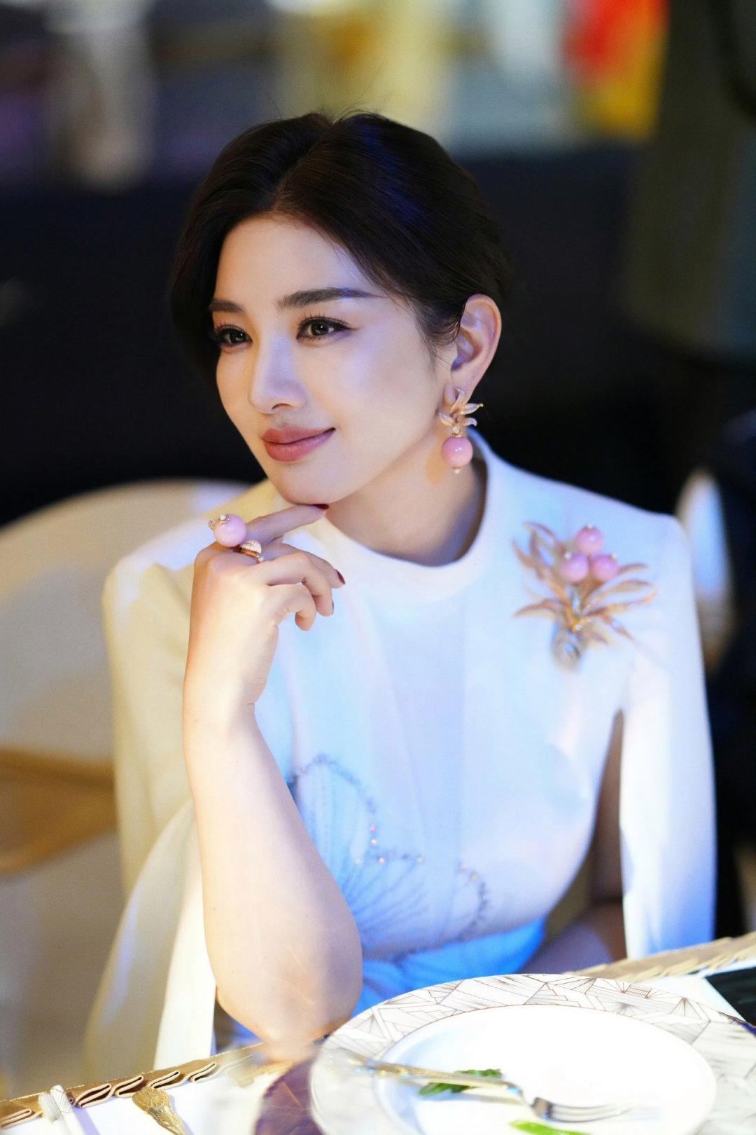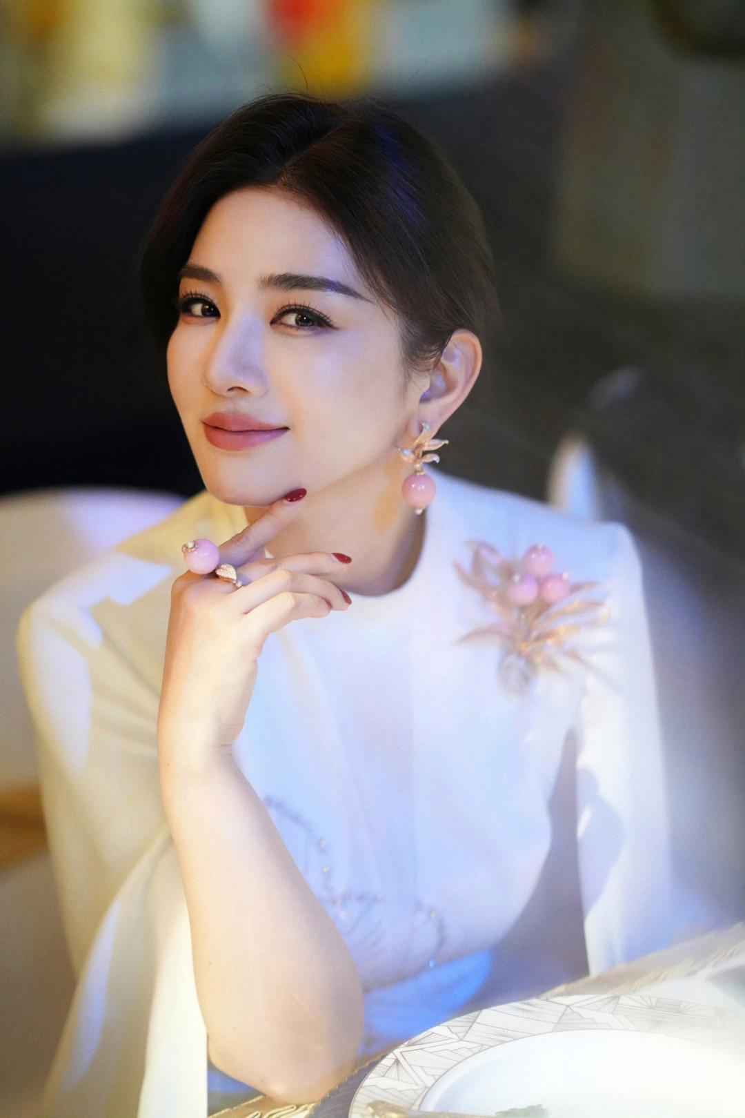 黄奕一袭白裙裹着柔光,肩颈那枚粉珠胸针衬得肤色像浸了蜜,同色系耳坠+戒指直接把“细节精致感”焊在身上,连红甲都甜得刚好。