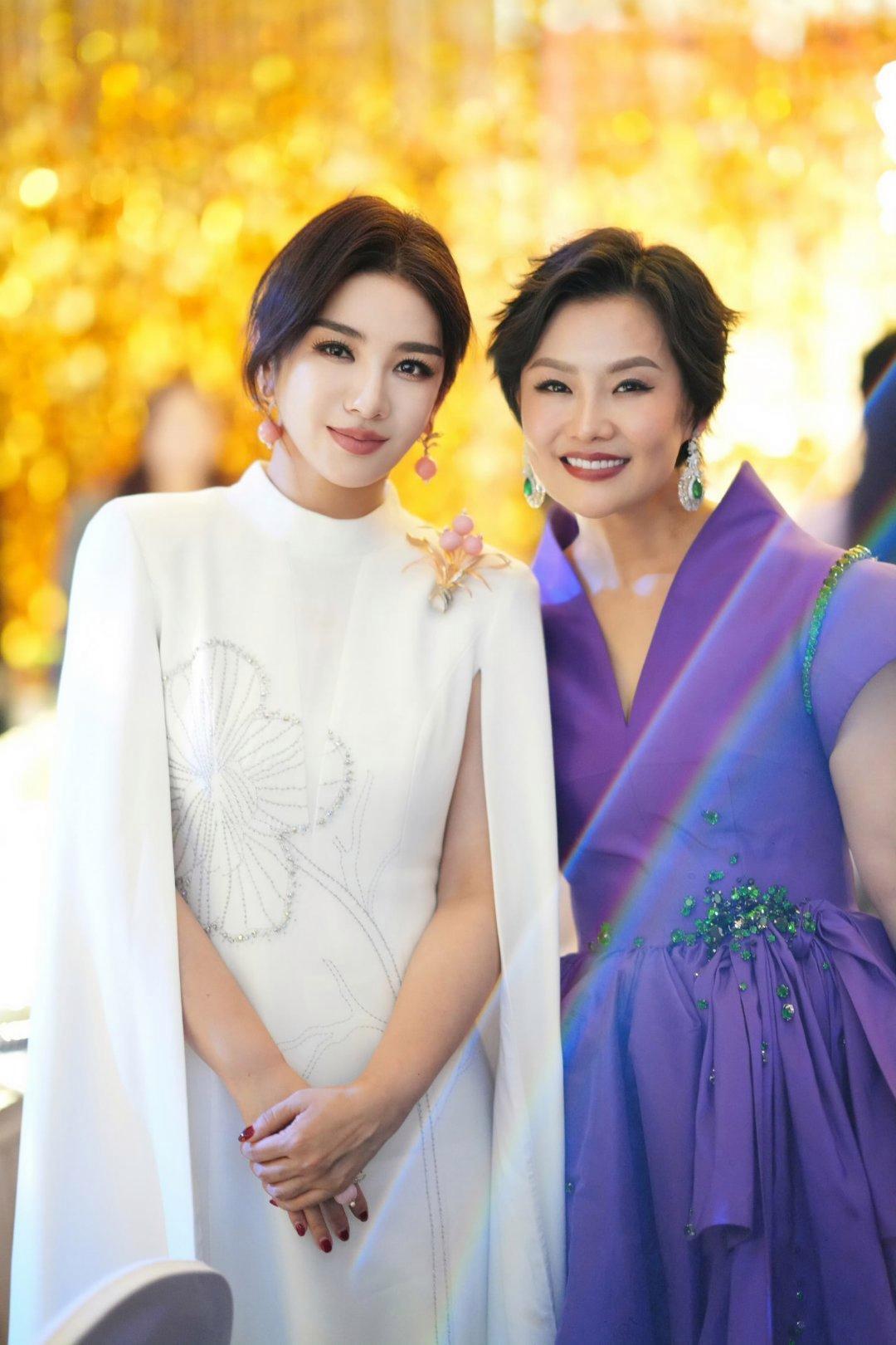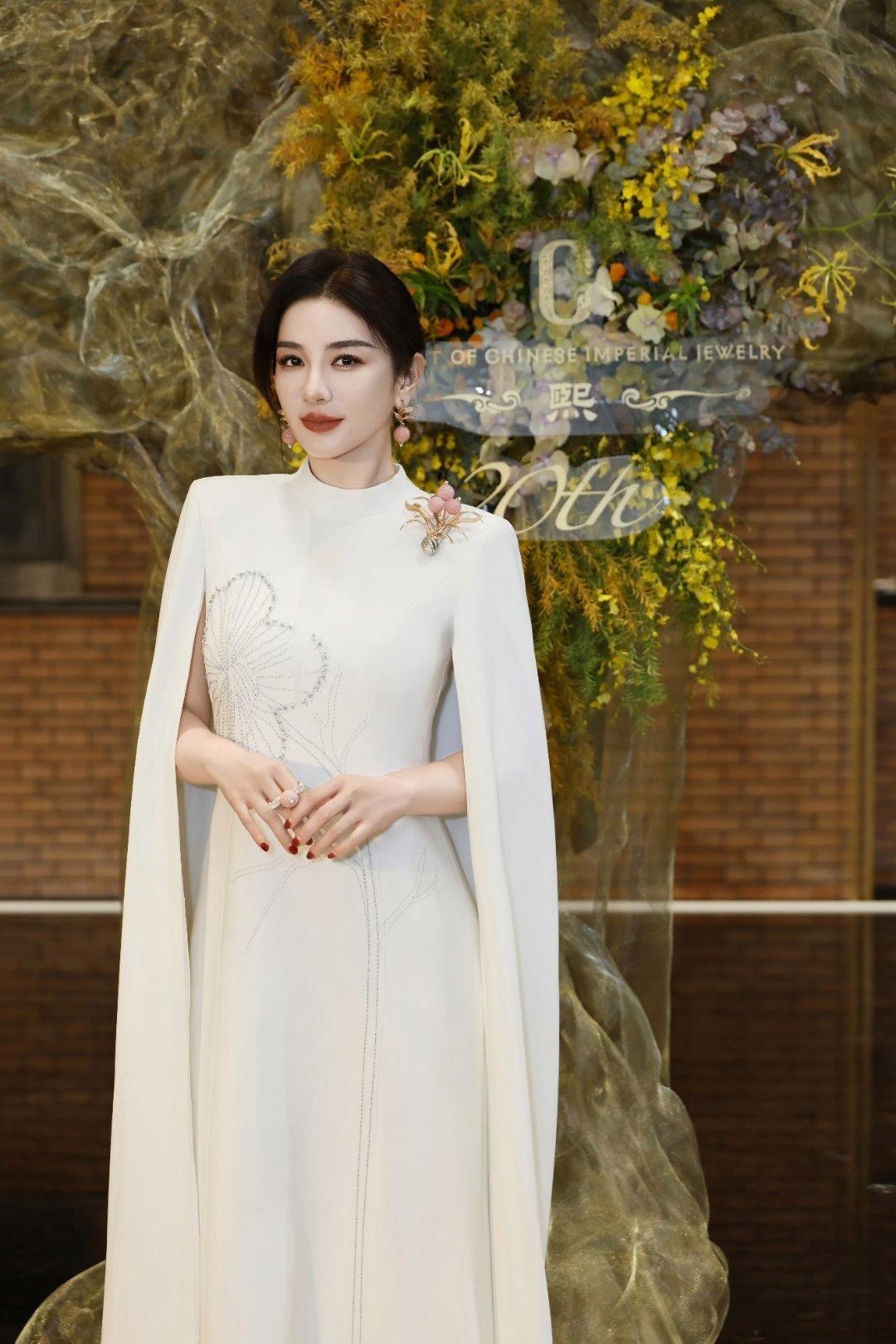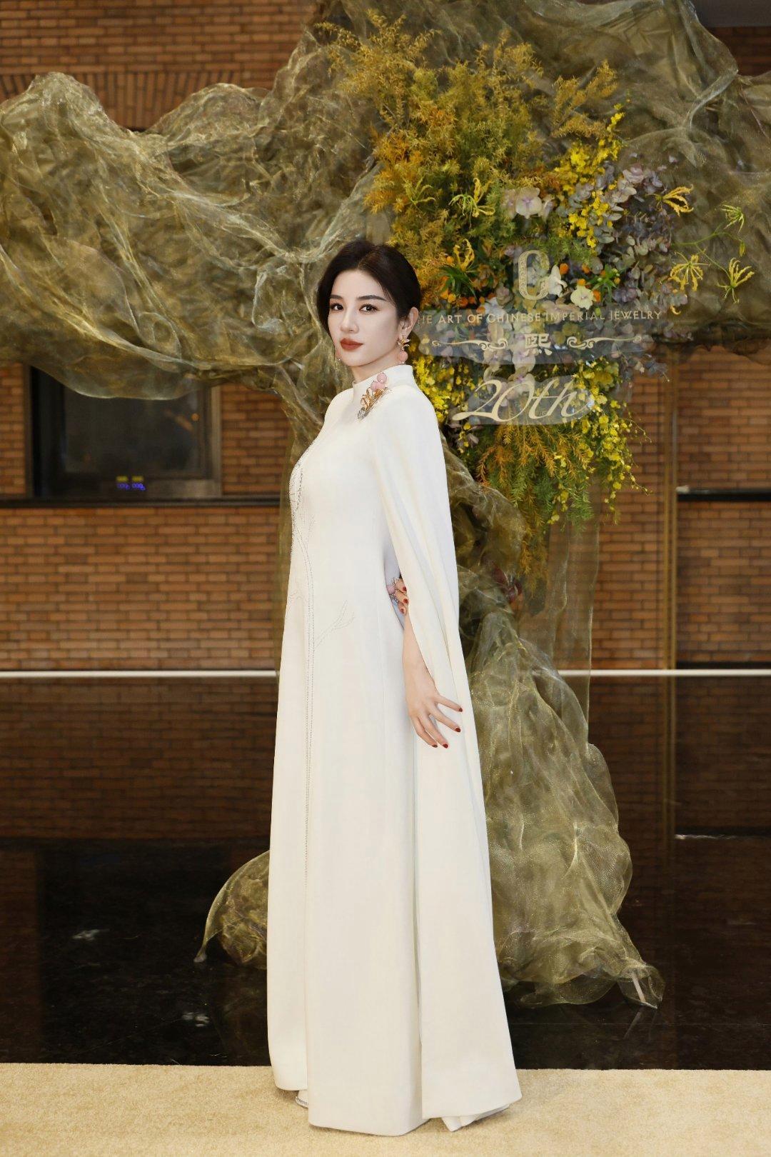 黄奕一袭高领白裙缀着水钻勾勒的花影,斗篷式披肩衬得肩颈线条又美又飒,胸口那枚粉珠胸针刚好戳中温柔感,连耳坠都是同色系的“甜酷呼应