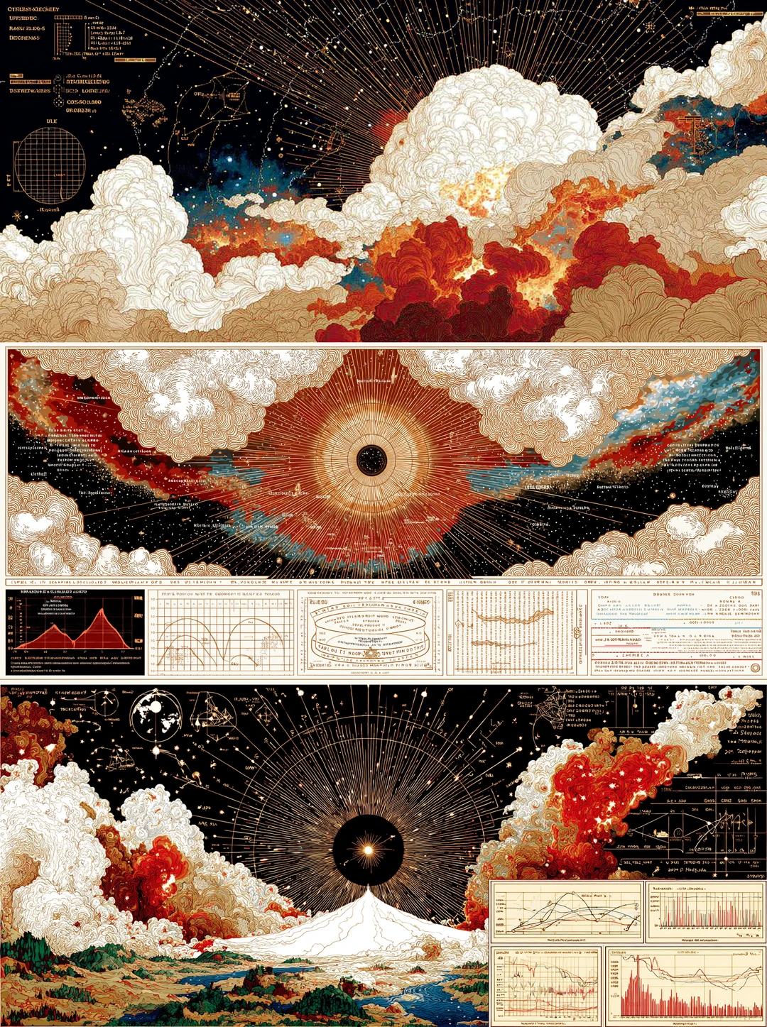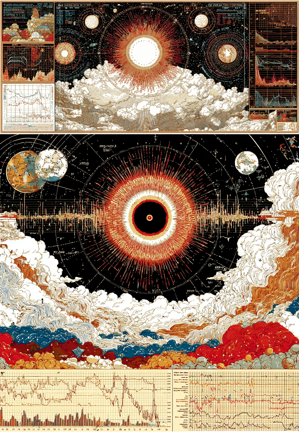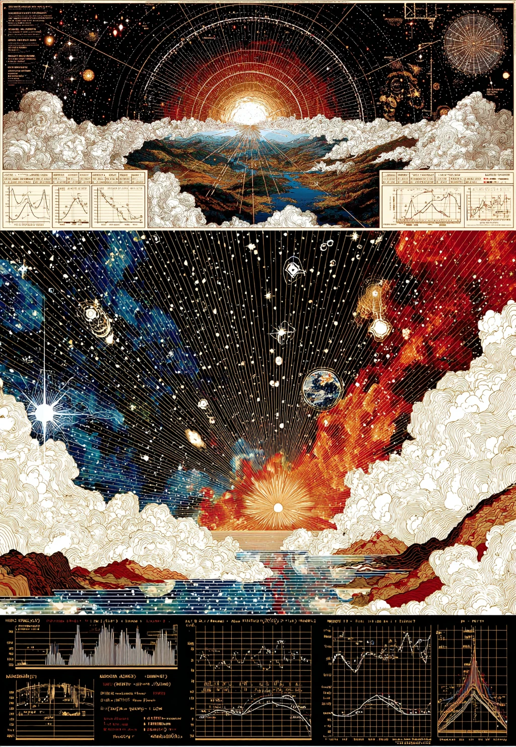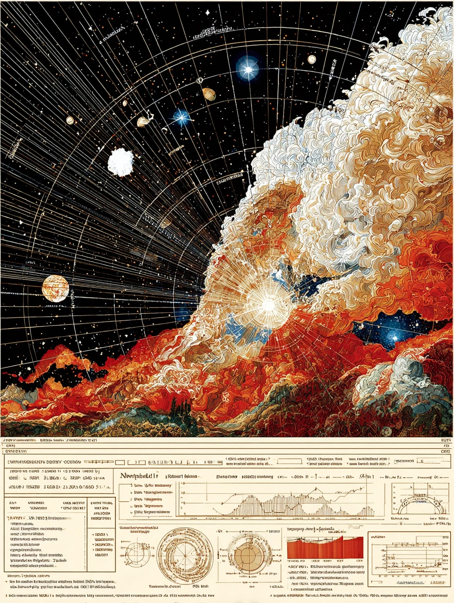 复古未来主义,天体知识杂志,多屏信息展示星系信息, 扭曲的时空,Win95界面与三维图示,多重宇宙的参数与模拟景象,遵循独特物理法则的平行宇宙,黑色背景上布满网格线,太空射线穿透星云,Gregory Crewdson 拍摄手法,构图严谨,电影级画面质感 sref: 2469426523 3923357878 raw