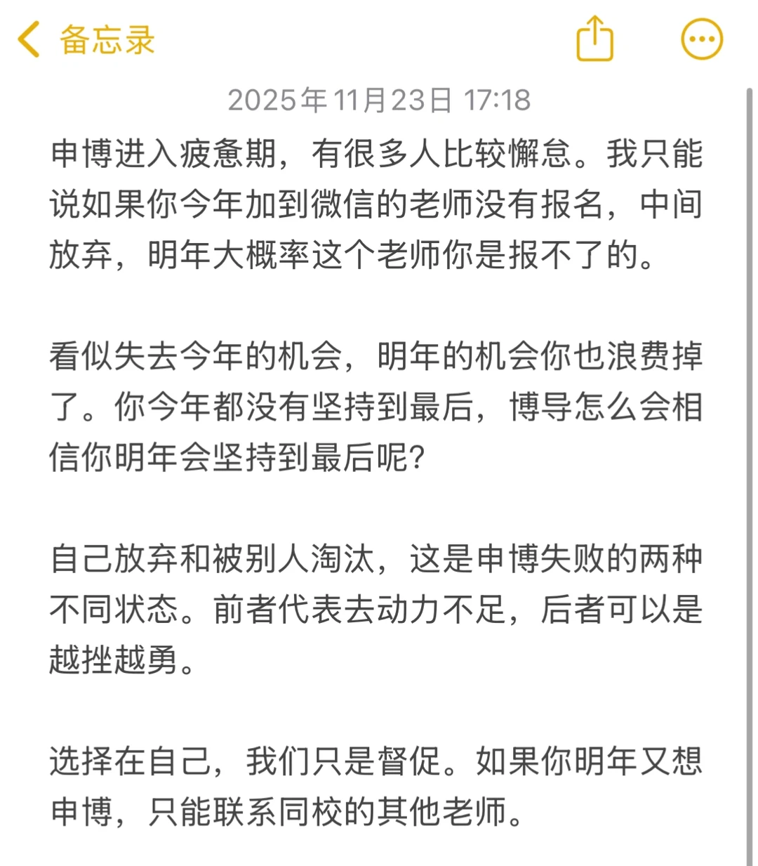 看似失去今年的机会,明年的机会你也浪费掉了。你今年都没有坚持到最后,博导怎么会相信你明年会坚持到最后呢?