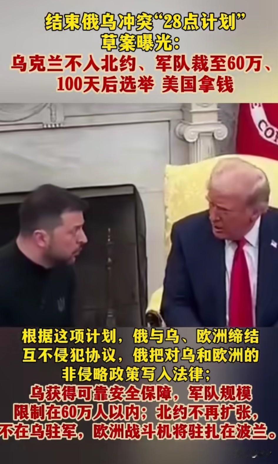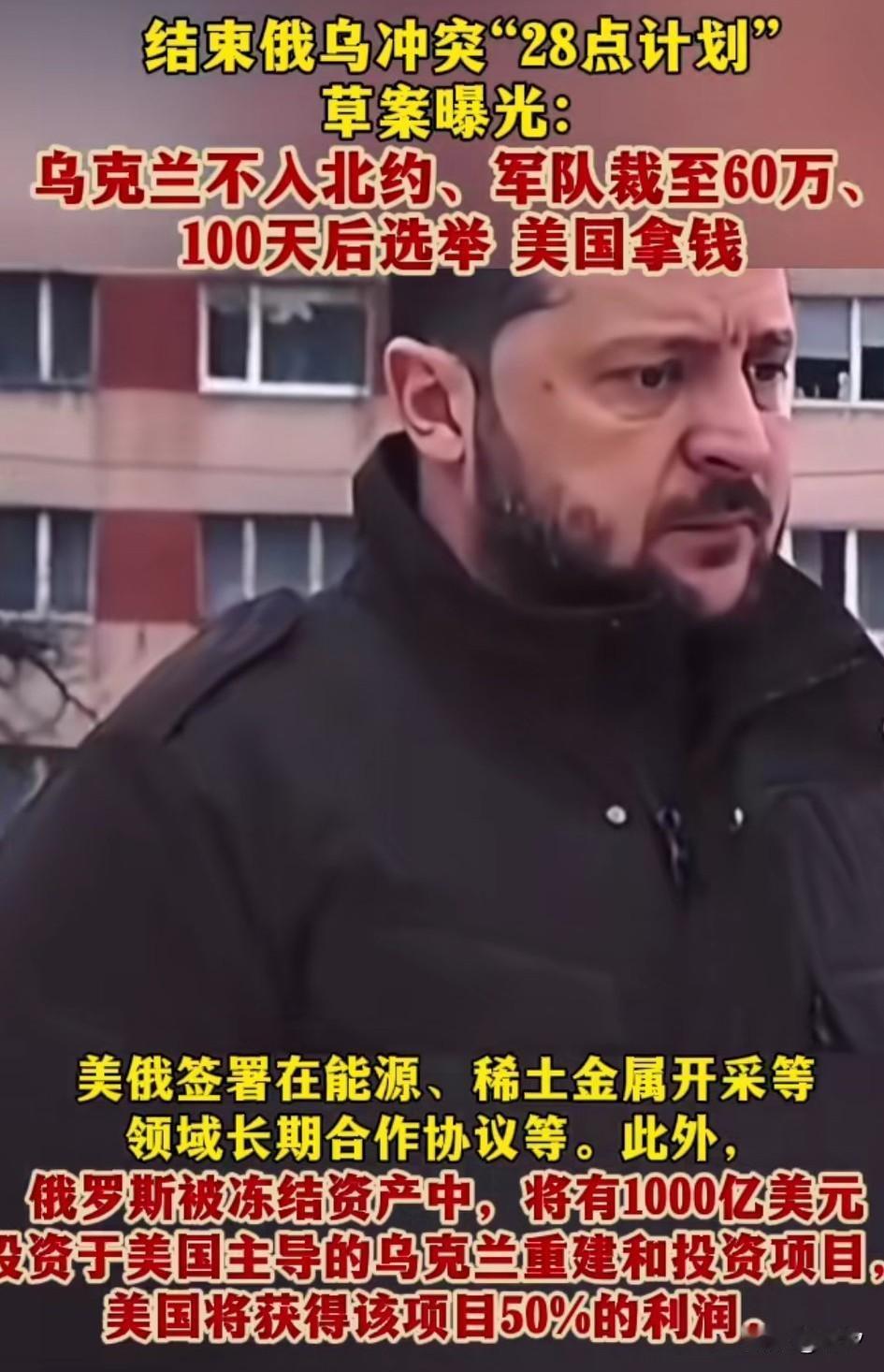 结束俄乌冲突的28点计划草案曝光, 乌克兰不入北约, 军队裁至60万, 100天后选举, 这次美国的如意算盘打的好, 由美国起草的这项草案, 可以看出是多方妥协的结果, 俄罗斯,乌克兰和欧洲缔结互不侵犯条约,相当于保证了乌克兰的安全, 乌克兰承认不加入北约, 北约承诺不再东扩, 这基本上实现了俄罗斯的意愿, 欧洲的战斗即将驻扎在波兰, 乌克兰将成为北约和俄罗斯的缓冲地带,欧洲是一点便宜都没给, 不知道出钱又出装备的欧洲会同意吗? 美俄签署了在稀土和能源合作多项领域的协议,承诺冻结俄罗斯的1000亿美元用于以美国为主导的乌克兰重建项目和投资,美国将获得该项目50%的利润, 可以看出美国又是来摘桃子的, 欧洲国家恐怕要慌了, 这就是典型的弱国无外交, 明明乌克兰才是当事人, 但是他却做不了主, 美国全程替他做主, 如果乌克兰和俄罗斯同意该项草案, 那俄乌战争可能真的就结束了, 只是乌克兰白忙活一场, 人口锐减,资源被夺, 国内经济一塌糊涂, 能不能恢复到战前的情况? 这谁也不好说, 大家觉得我可能会同意美国提出的28点计划吗? 聚焦俄罗斯乌克兰局势论乌克兰危机