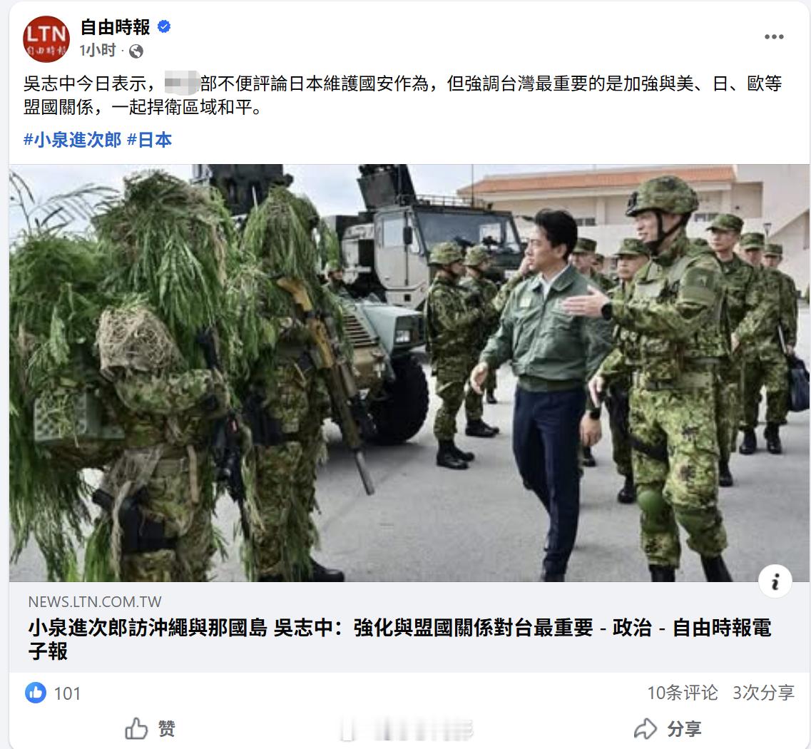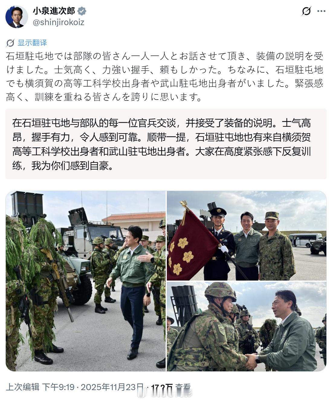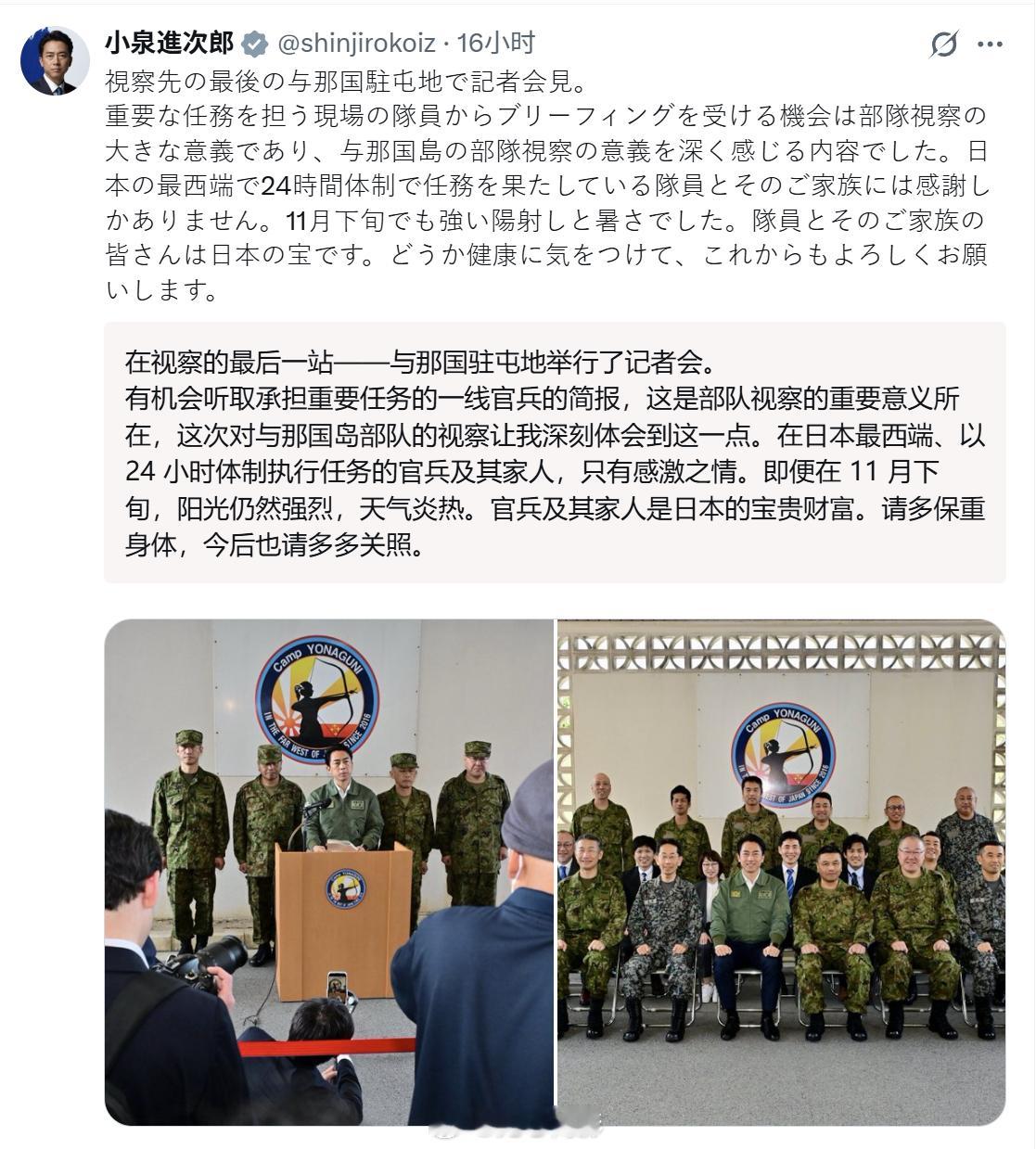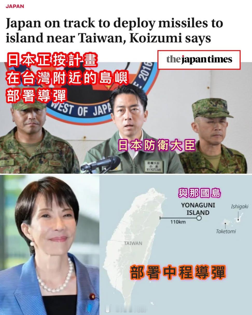 日本防卫大臣小泉进次郎,昨天视察石垣岛和与那国岛的陆上自卫队,各媒体跟进报道称,日本计划在距离台湾省仅110公里的与那国岛部署地对空导弹部队。小泉在昨天的会谈中表示,“当前日本正面临二战结束后最为严峻复杂的安全环境。为捍卫包括与那国岛民众在内的日本国民的和平生活,我们必须全面提升自卫队的防御能力。”小泉此行的讲话,以及曝光的导弹部署计划,正值中日两国关系高度紧张的时刻,有记者质疑此举是否会加剧地区紧张局势。小泉对此则予以否认,并解释说,计划在当地部署的中程地对空导弹部队“旨在强化岛屿防卫”,能够“降低日本遭受武装攻击的可能性”。他还辩称,该部署是防御性措施,与加剧地区紧张并无因果关系,“因此认为这会使局势紧张的观点并不准确。”在被问及日本可能在台海紧急事态中将扮演何种角色时,小泉明确表示这是假设性情况,并拒绝直接评论,但他又补充说,“直接听取在严峻环境下执行任务的自卫队官兵的意见更为重要。”与此同时,台湾省似乎也得到了某种信号,今天台湾省断交部长吴志中跑出来评论此事,他们“不便评论日本维护国安作为”,“但强调台湾最重要的是加强与美、日、欧等同盟关系”,“一起捍卫区域和平”。