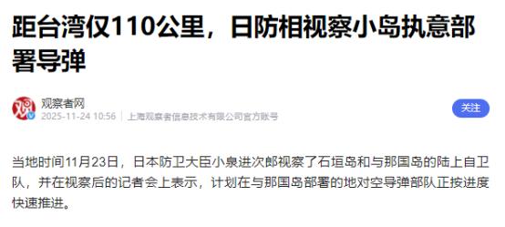 这是要把刀架到我们脖子上啊!11月24日凌晨,日本防卫大臣小泉进次郎明确表示,在距离台湾约110公里的与那国岛部署中超导弹的计划正在按计划推进!   很多人可能对110公里没概念,这个距离是什么意思?从与那国岛开车到台湾本岛,比从北京到天津还近。   战机从这里起飞,十分钟内就能出现在台海周边空域。导弹一升空,台湾东部海域、宫古海峡西口全在覆盖范围里,这已经不是简单的军事部署,是把尖刀直接顶在了家门口。   与那国岛本身就是块战略要地,它是日本最西端的岛屿,正好卡在第一岛链的关键节点上。中国海军要前出西太平洋训练,商船往返太平洋沿岸国家,宫古海峡都是必经之路。日本直言不讳,在这建导弹基地,核心就是想“封锁宫古海峡”。   这次要部署的导弹也不是吃素的,主力是改进型03式中程地空导弹,三菱重工造的这款武器,能同时追踪100个目标,还能挑12个重点攻击。改进后速度飙到4马赫,射程也从50公里提到了100公里左右,去年在美国试射时,连超音速靶弹都能精准拦下来。   更要命的是,日本不光要摆上这款防空导弹,还在琢磨把高超音速导弹也搬过来。那款叫HVGP的“岛屿防御用高速滑翔弹”,看着名字像防御装备,实则是能主动出击的狠角色。射程能覆盖东亚大陆腹地,明年就要正式服役,美国还专门批了2亿美元军售帮它搞研发。   日本敢这么干,背后全是美国在撑腰。美国给它递技术、卖设备,甚至帮着搞测试,就是想把日本打造成“印太战略”的马前卒。而日本正好借这个机会,一步步突破战后的军事限制,实现它“军事正常化”的野心。这俩国家一唱一和,就是想在东亚织一张遏制网。   现在的与那国岛,已经有日本自卫队的沿岸监视部队和雷达站了。导弹基地一建完,这里就形成了“监测-打击”一条龙的能力。再加上宫古岛、石垣岛现有的军事设施,三个点连起来,就能对经过海峡的舰船形成南北夹击的态势。   日本首相高市早苗之前在国会都明说了,台湾有事可能就是日本的“存亡危机事态”。这句话翻译过来就是,一旦台海有动静,日本自卫队就有借口插手。现在把导弹部署到家门口,就是把这种口头表态变成了实实在在的军事威慑。   有人说日本这是在赌,赌中国不敢破局。可它忘了,这种把自己绑在别人战车上的做法,本身就是在引火烧身。与那国岛离台湾这么近,真要是台海局势升温,这个导弹基地第一个就得面临风险。   日本的军事转型早就越界了。从只能搞自卫的轻型装备,到现在研发射程几千公里的进攻性武器,所谓的“专守防卫”早成了空话。它以为抱上美国的大腿就安全了,却没看清自己只是别人棋盘上的一颗棋子。   中国从来不会主动挑事,但也绝不怕事。对于这种明目张胆的挑衅,外交部已经多次明确表态,坚决反对任何危害中国主权和安全的行为。中国海军的常态化巡航一直在进行,反导系统的升级也从没有停过。   110公里的距离,够近,但也够清楚。日本想把刀架在我们脖子上,就得先掂量掂量自己的肩膀能不能扛住反作用力。东亚的和平稳定不是靠一两件武器就能破坏的,任何试图逆流而动的人,最终都只会搬起石头砸自己的脚。