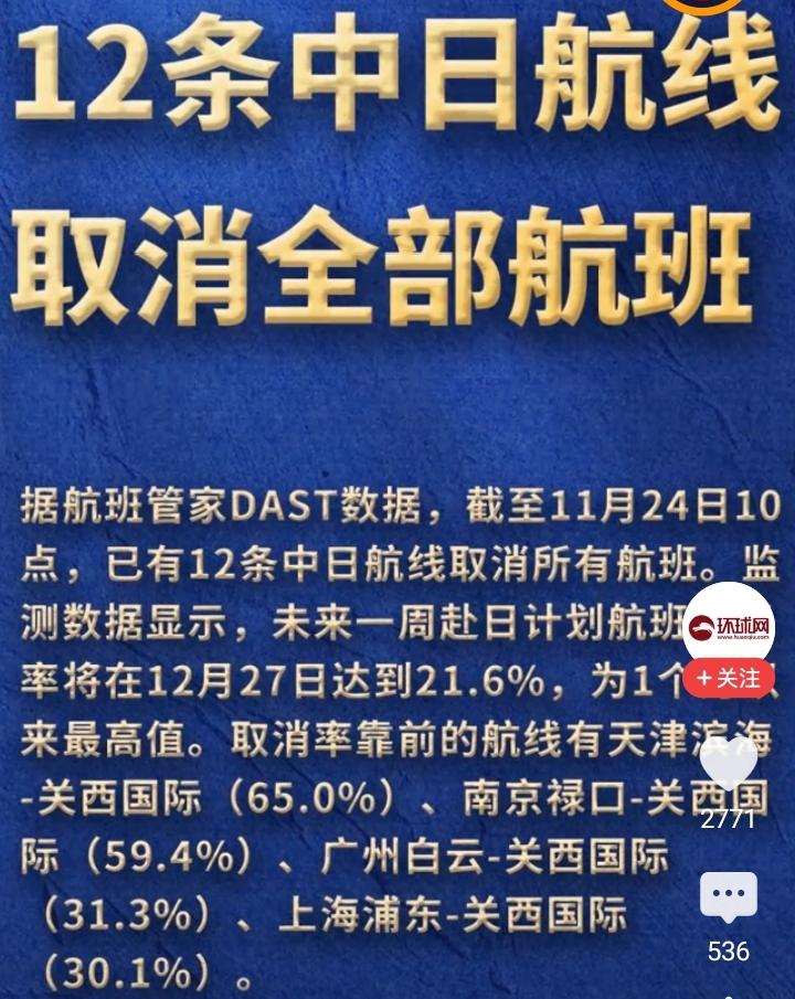 详细的12条中日航线取消全部航班信息来了。 1. 天津:涉及天津滨海至日本关西国际机场、天津滨海至日本东京羽田机场两条航线,其中天津-关西航线未来一周取消率达65.0%,是取消率最高的航线; 2. 南京:为南京禄口至日本关西国际机场航线,未来一周取消率59.4%;3. 广州:为广州白云至日本关西国际机场航线,未来一周取消率31.3%; 4. 上海:包含上海浦东至日本关西国际机场、上海浦东至日本新千岁机场两条航线,前者未来一周取消率30.1%; 5. 无锡:为无锡硕放至日本大阪关西国际机场航线,12月1日起取消每日1班航班; 6. 北京:为北京大兴至日本大阪关西国际机场航线,11月30日起每日2班中1班取消; 7. 长沙:为长沙黄花至日本大阪关西国际机场航线,11月30日起每周3班航班全部停售; 8. 大连:为大连周水子至日本福冈机场航线,11月28日起每周1班航班关闭预订; 9. 杭州:涉及杭州萧山至日本中部国际机场航线; 10. 深圳:为深圳宝安至日本名古屋中部国际机场航线。 另外,未来一周赴日航班取消率将在11月27日达到21.6%,创1个月以来最高 。且多家航司还推出了赴日机票免费退改签政策,后续航线是否恢复,取决于中日关系的走势。