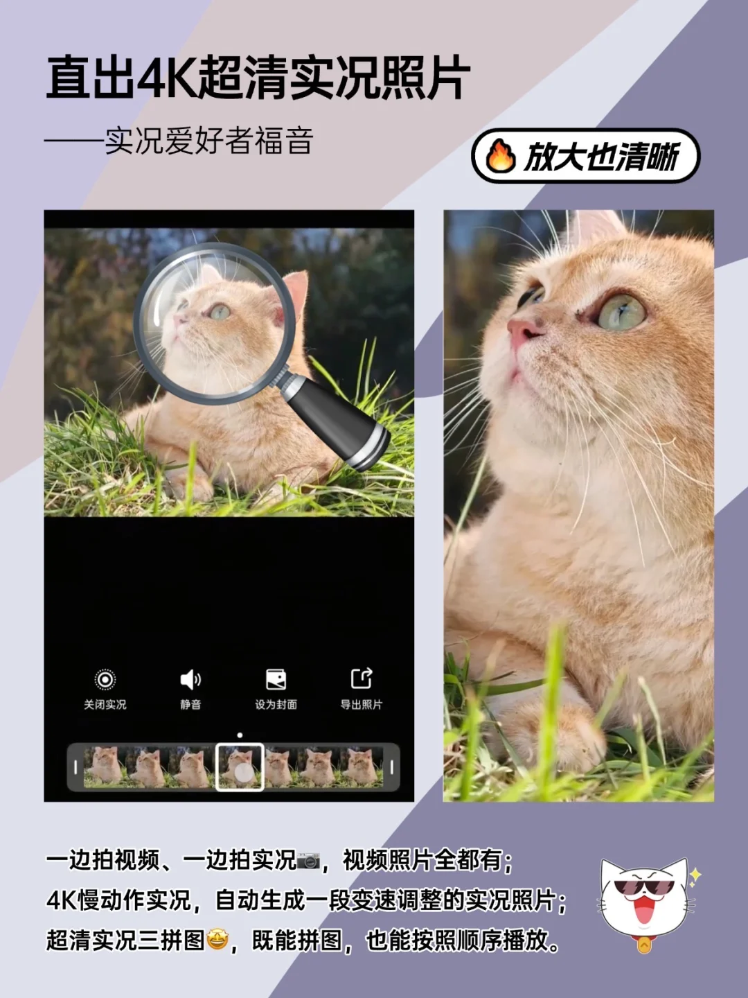 全系首发直出4K超清实况照片✨,比传统实况Live画质提升了4倍,画质非常的清晰。就跟你用手机拍4K视频一样,把每帧拿出来,都可以当作超清壁纸的程度,实况爱好者[微笑R]瞬间幸福了!