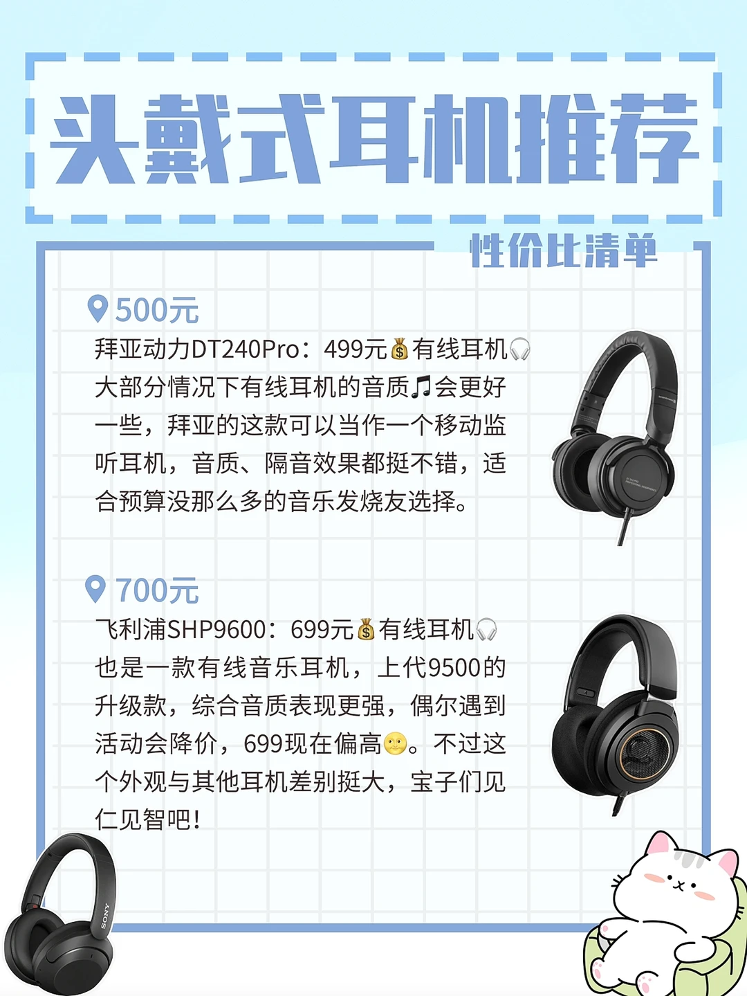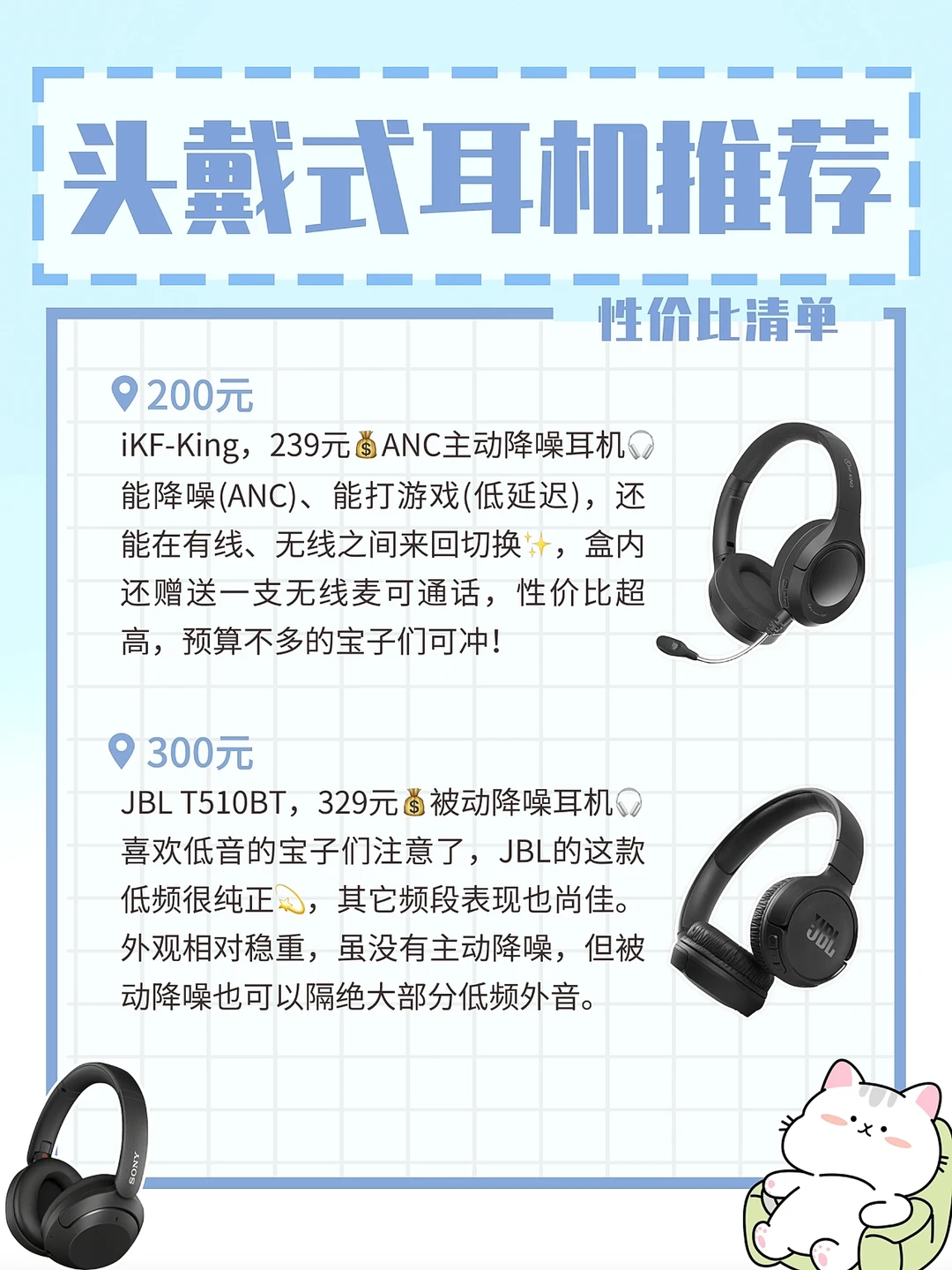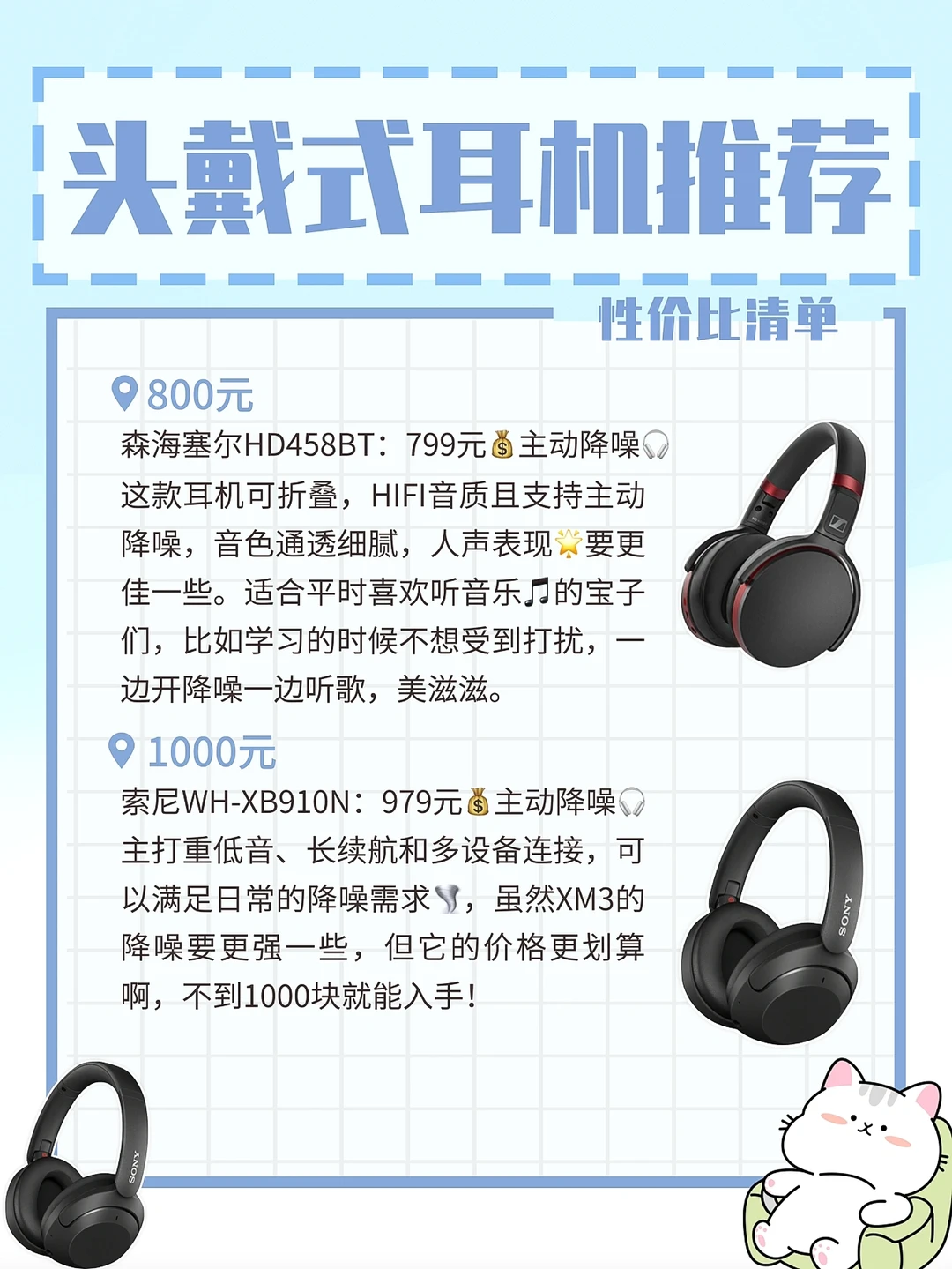 如何挑选一款适合自己的头戴式耳机🎧,今天给大家分享6⃣️款性价比不错的耳机,价格💰最高不超过1000元,产品都放图里啦,需要的自取! 1⃣️头戴式耳机分类 如果从用途出发,头戴式耳机有带降噪、