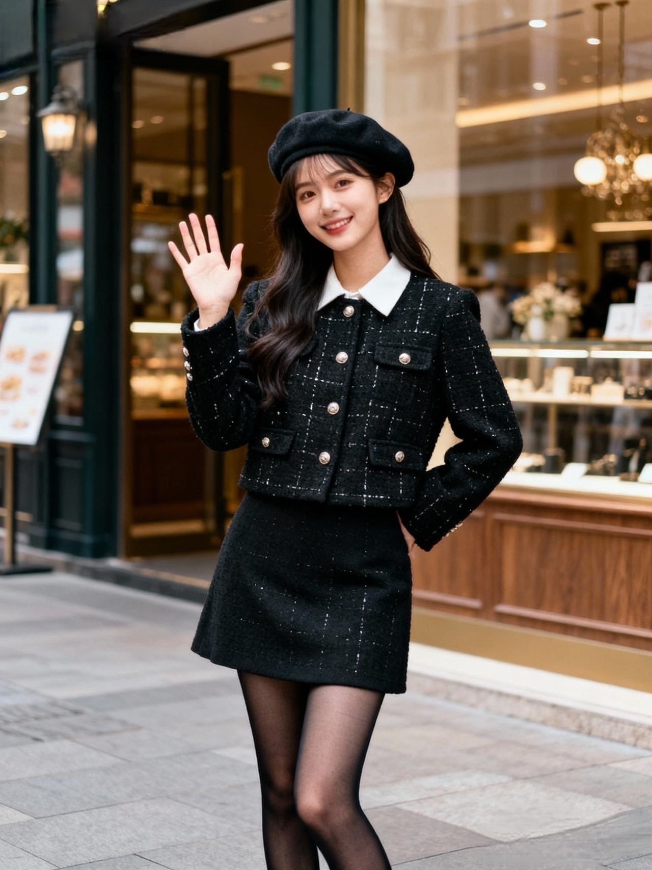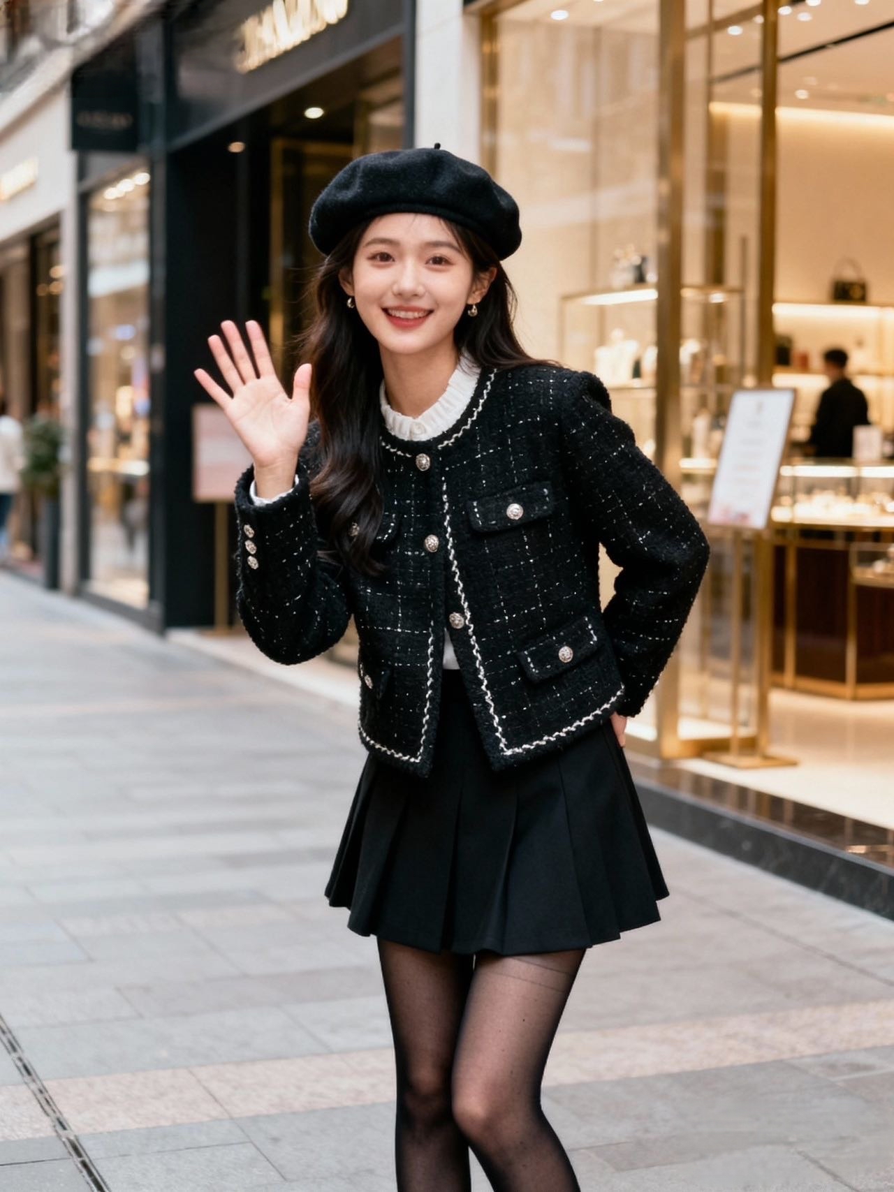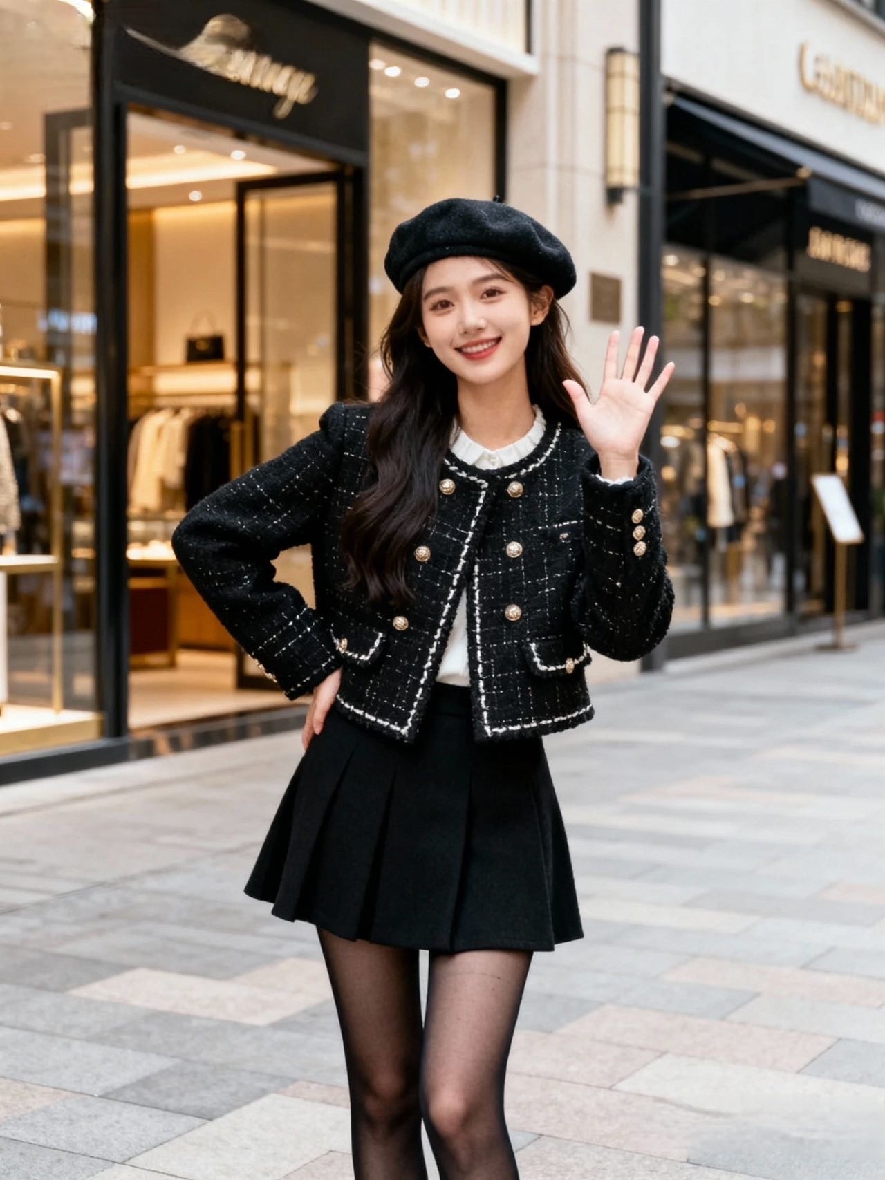 今天是法式甜酷大小姐风~粗花呢短外套缀着银扣,自带精致闪光感,内搭木耳边白衬衫温柔又减龄,配百褶裙和贝雷帽,甜飒感刚好~