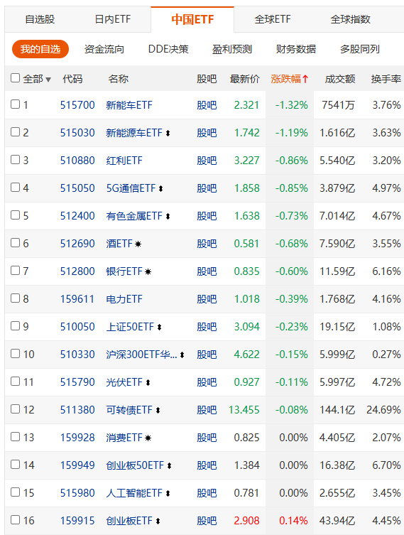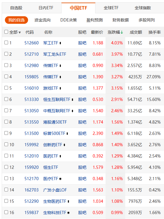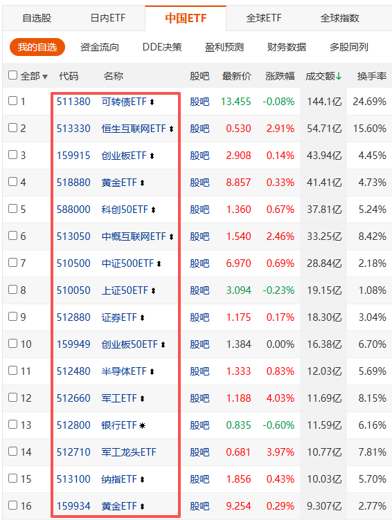 今天是军工和传媒这种小中ETF在涨,红利,新能源,有色,白酒,银行ETF反而在跌,说明机构今天压根就没买,都是游资在买。主流的可转债,黄金,恒生互联,科创50算是止跌了,恒生科技已经走到了短期反弹的位置了。