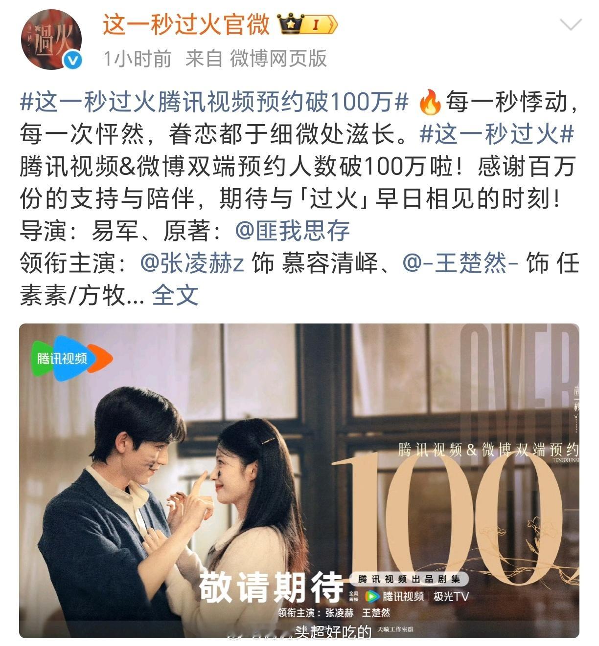张凌赫王楚然《这一秒过火》预约破百万庆祝海报来了,民国剧这种破百万的速度很少见
