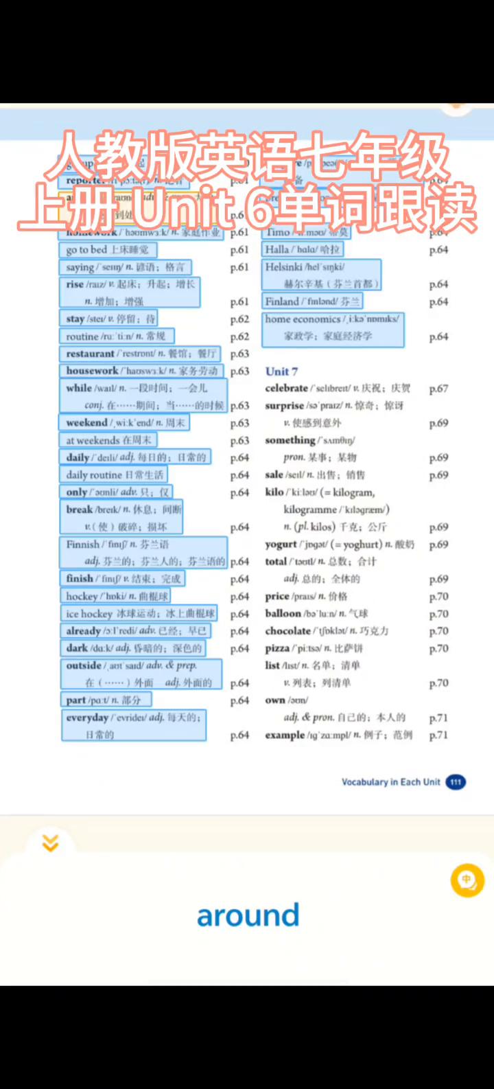 人教版英语七年级上册Unit6单词跟读。 unit six: make use of quarter shower. take a shower. get dressed. rush tooth. teeth. duty. on duty. usually get up. reporter around. homework. go to bed. saying rise. stay routine. restaurant. housework. while weekend. at weekends. daily routine. only break. finish. finish. hockey. ice hockey. already dark. outside. part. every day. prepare. prepare something for timo. hala. helsinki. finland. home economics.