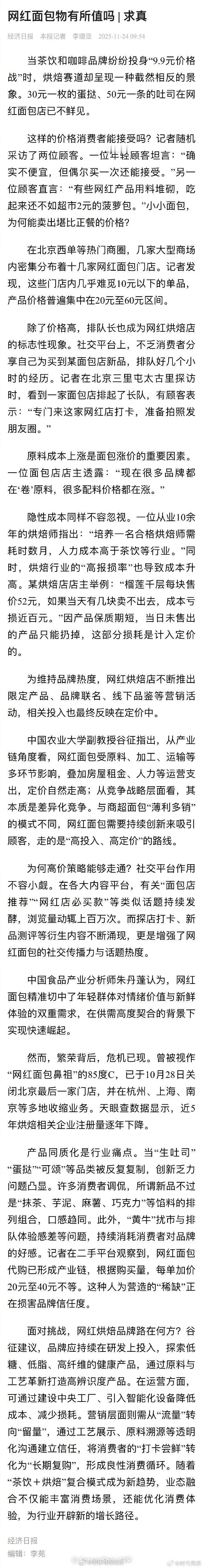 ?【】当茶饮和咖啡品牌纷纷投身“9.9元价格战”时,烘焙赛道却呈现一种截然相反的景象。30元一枚的蛋挞、50元一条的吐司在网红面包店已不鲜见。原料成本上涨是面包涨价的重要因素。一位面包店店主透露:“现在很多品牌都在‘卷’原料,很多配料价格都在涨。”为维持品牌热度,网红烘焙店不断推出限定产品、品牌联名、线下品鉴等营销活动,相关投入也最终反映在定价中。 然而,繁荣背后,危机已现。曾被视作“网红面包鼻祖”的85度C,已于10月28日关闭北京最后一家门店,并在杭州、上海、南京等多地收缩业务。天眼查数据显示,近5年烘焙相关企业注册量逐年下降。(经济日报)