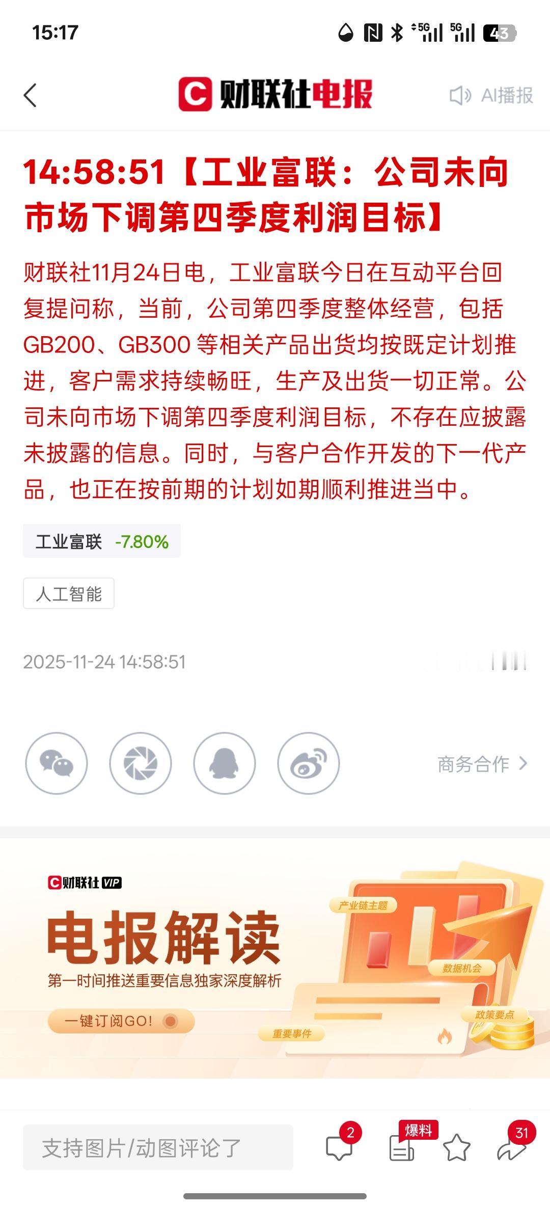 工业富联:公司未向市场下调第四季度利润目标,今天又出现了较大幅度的下跌,盘中跌幅7%点几!根据工业富联公布的信息,客户的订单出货量正在正常进行,并没有其他疑问,那市场的需求量也比较旺!股价的下跌完全就是资金所主导的,那利润季度应该还会有所增,AI人工智能发展需要大量的服务器!