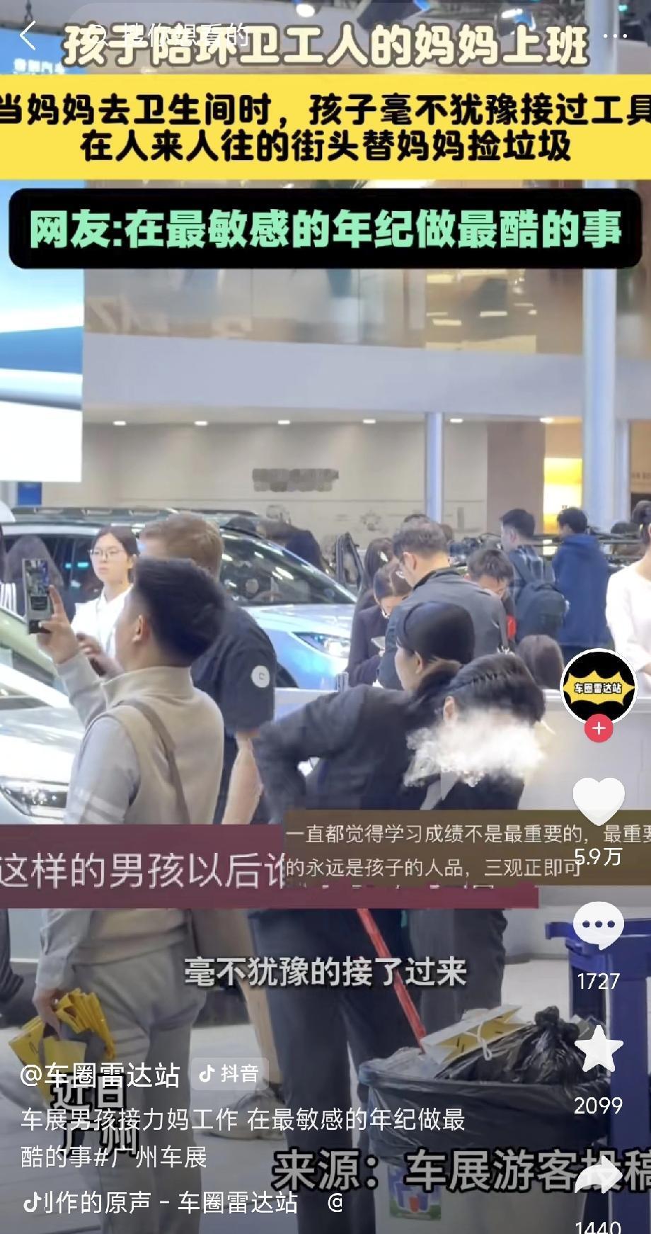 广州车展出现感人的一幕,一男生在车展内帮环卫工打扫卫生。 据了解,这位男生是奇瑞展台的讲解员,他与他的妈妈都在这里工作,妈妈是保洁员,当时他的妈妈去了洗手间,他在闲余之时过去拿起妈妈的簸箕扫把开始认真的扫地,里面人很多,但是他完全不会在意别人的看法,他就像多帮妈妈分担一些工作,让妈妈多休息一下。 男子很年轻,他没有在这样的公开场合嫌弃自己的妈妈,这可能是很多人都做不到的,他们觉得面子很重要,但是男子却不是这么想的。 有不少网友觉得,这样的男子很孝顺,对于父母来说,他是一个好孩子,这样的男子一定会有很多女孩子喜欢,他的工作也一定很顺利。