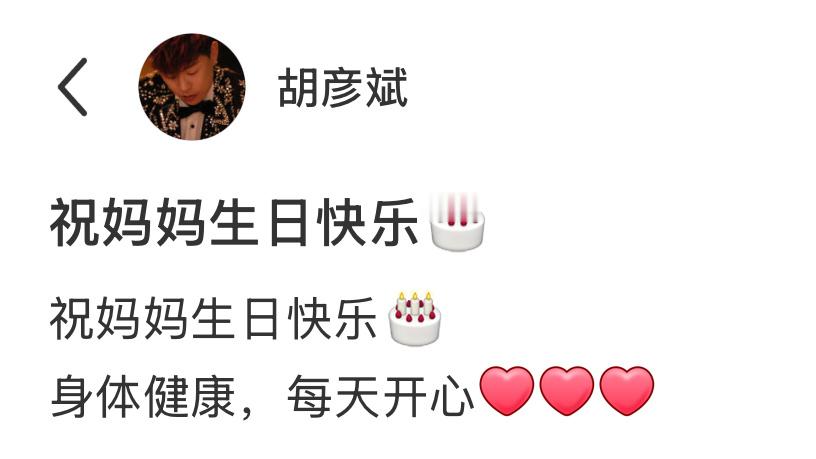 胡彦斌晒合照为妈妈庆生:“祝妈妈生日快乐,身体健康,每天开心”❤️