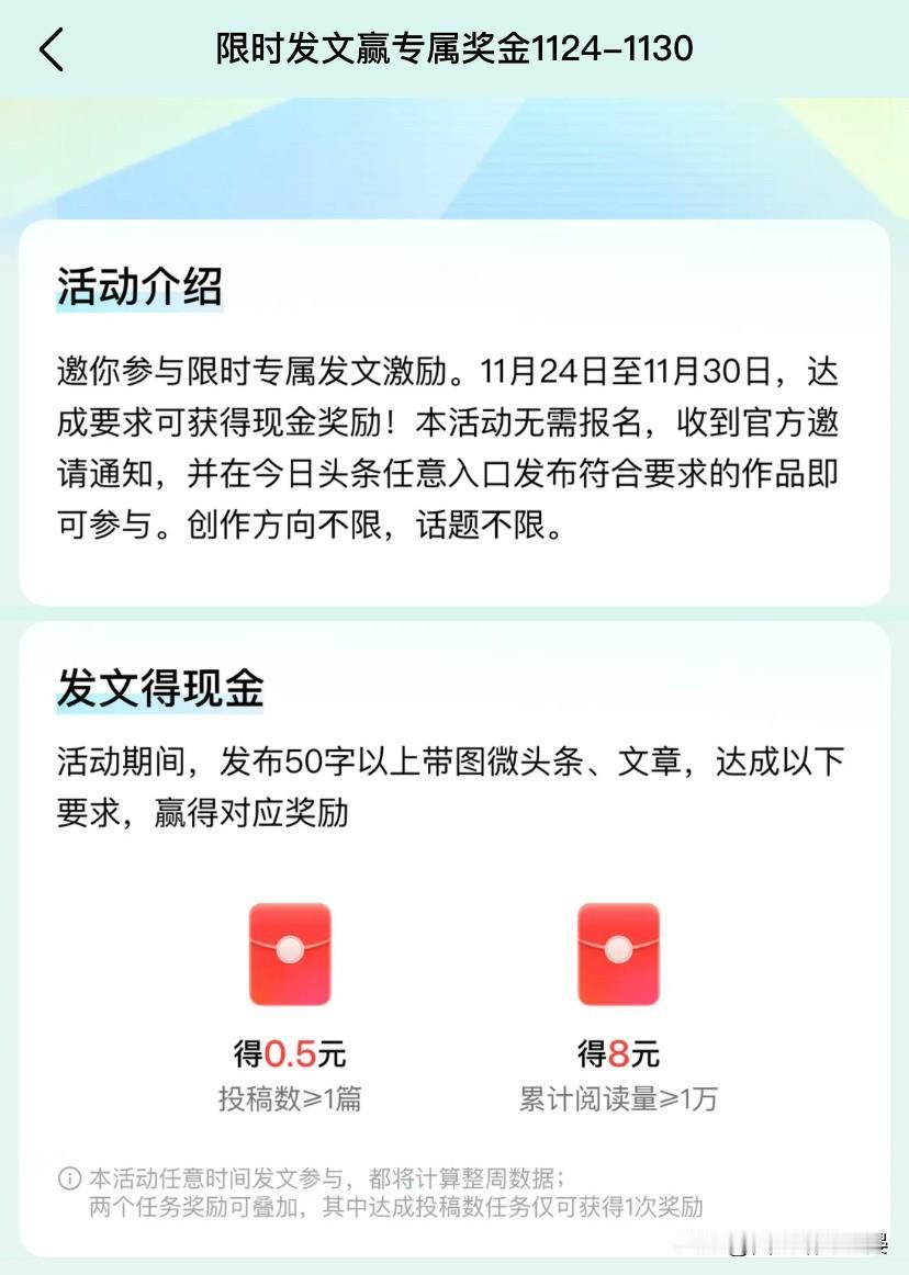 最新一期头条限时发稿领奖金的活动又来啦!您收到信息了吗? 11月24-30日,今日头条送钱活动来啦!只要你收到邀请,发个50字以上带图的微头条或文章,就能拿钱! 奖励分两种: 发至少1篇就能拿0.5元; 要是微头条、文章累计阅读量超过1万,还能再拿8元; 这两个奖励可以一起领,不过发稿数的奖励只能领一次哦。 随便写了段日常带张图,分分钟达标拿了0.5元,现在就等阅读量冲万赚8元啦!这羊毛不薅白不薅,友友们赶紧行动,说不定下一个拿钱的就是你~