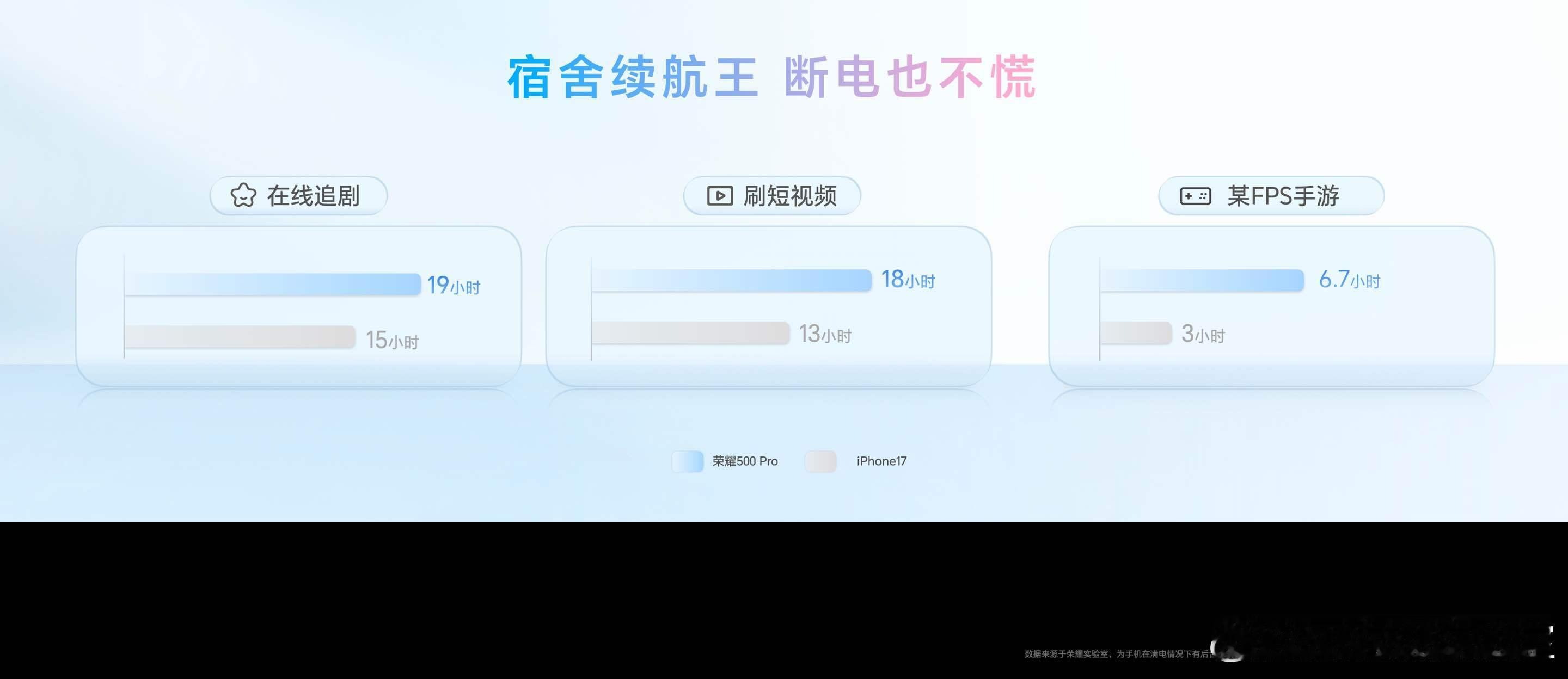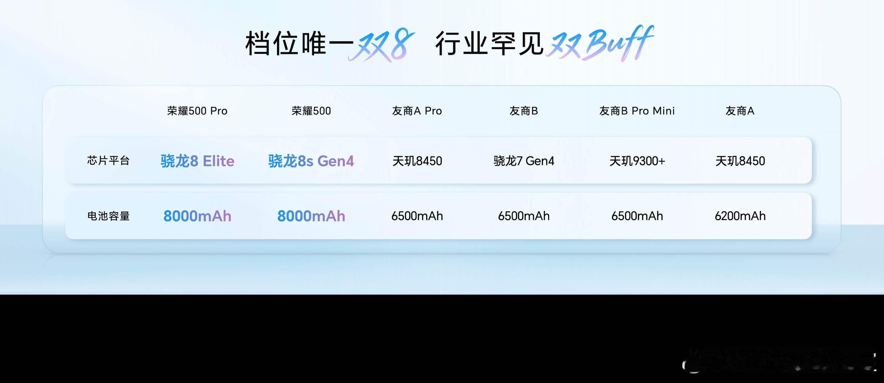 全系搭载8000mAh青海湖大电池,并搭载旗舰同款HONOR E2能效增强芯片及都江堰AI电源管理系统,深度优化电池使用场景。 荣耀500系列搭载80W有线超级快充,Pro搭载50W无线超级快充,并全系支持行业最强的27W有线反向充电。