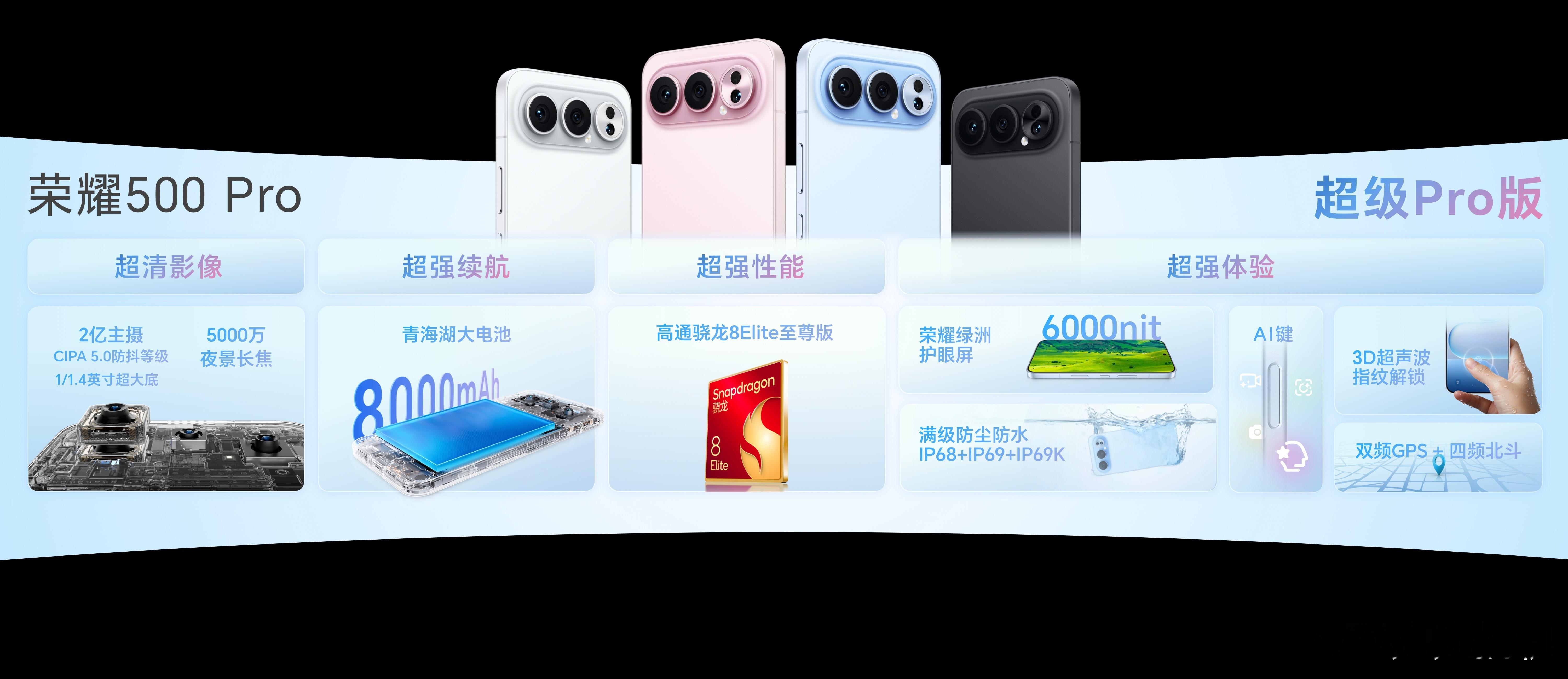 性能方面,荣耀 500 骁龙 8s Gen4,Pro 版是骁龙 8 Elite,都支持幻影引擎 3.0 。续航方面,全系 8000mAh 青海湖电池,标准版80W 有线快充,Pro 支持 80W 有线快充 + 50W 无线快充 + 27W 有线反充。 价格方面,荣耀500标准版12GB+256GB 2699元起售,荣耀500 Pro版12GB+256GB 3599元起售。