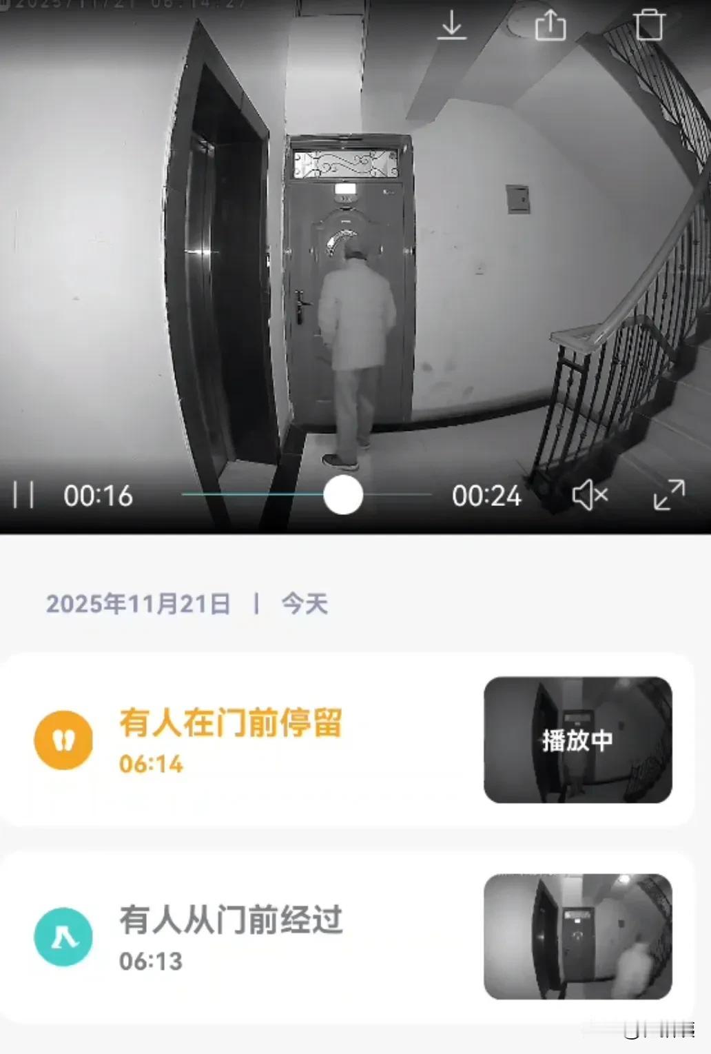 监控拍下,鬼鬼祟祟的,是不是小偷来踩点? 我姐两口子最近不在家,她家对门是空房,监控显示,有个中年男子,在家门口停留,通过猫眼,左边看看,右边看看,随后乘电梯下去。 幸好家中装了智能监控,可以实时记录,并会在手机上发出提醒,是路过还是停留。 [加油][加油][加油] 中兴的AI家庭网络,是藏在连接里的默契守护。FTTR+Wi-Fi 7的全场景覆盖,客厅的视频通话、阳台的智能家居都流畅无阻,再也没有信号盲区的烦恼。AI会智能分配网络资源,这种“无感连接”就像家里沉默的管家,不用刻意指令,却总能在需要时提供稳稳的支撑,让科技融入日常而不打扰