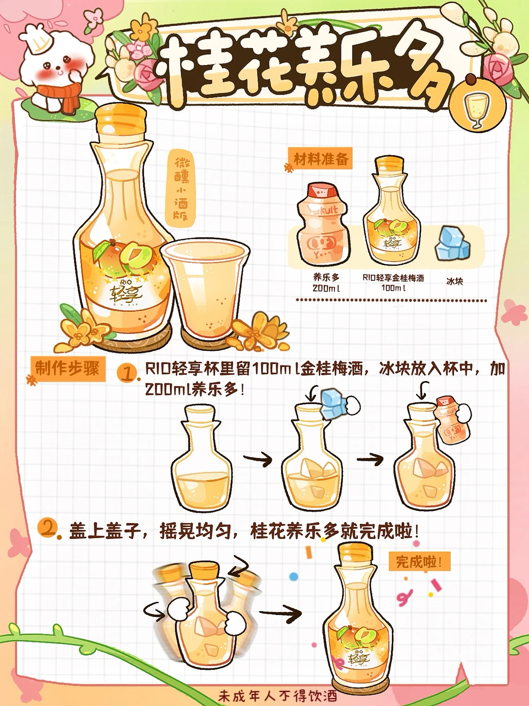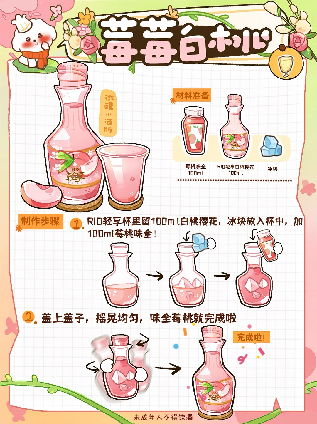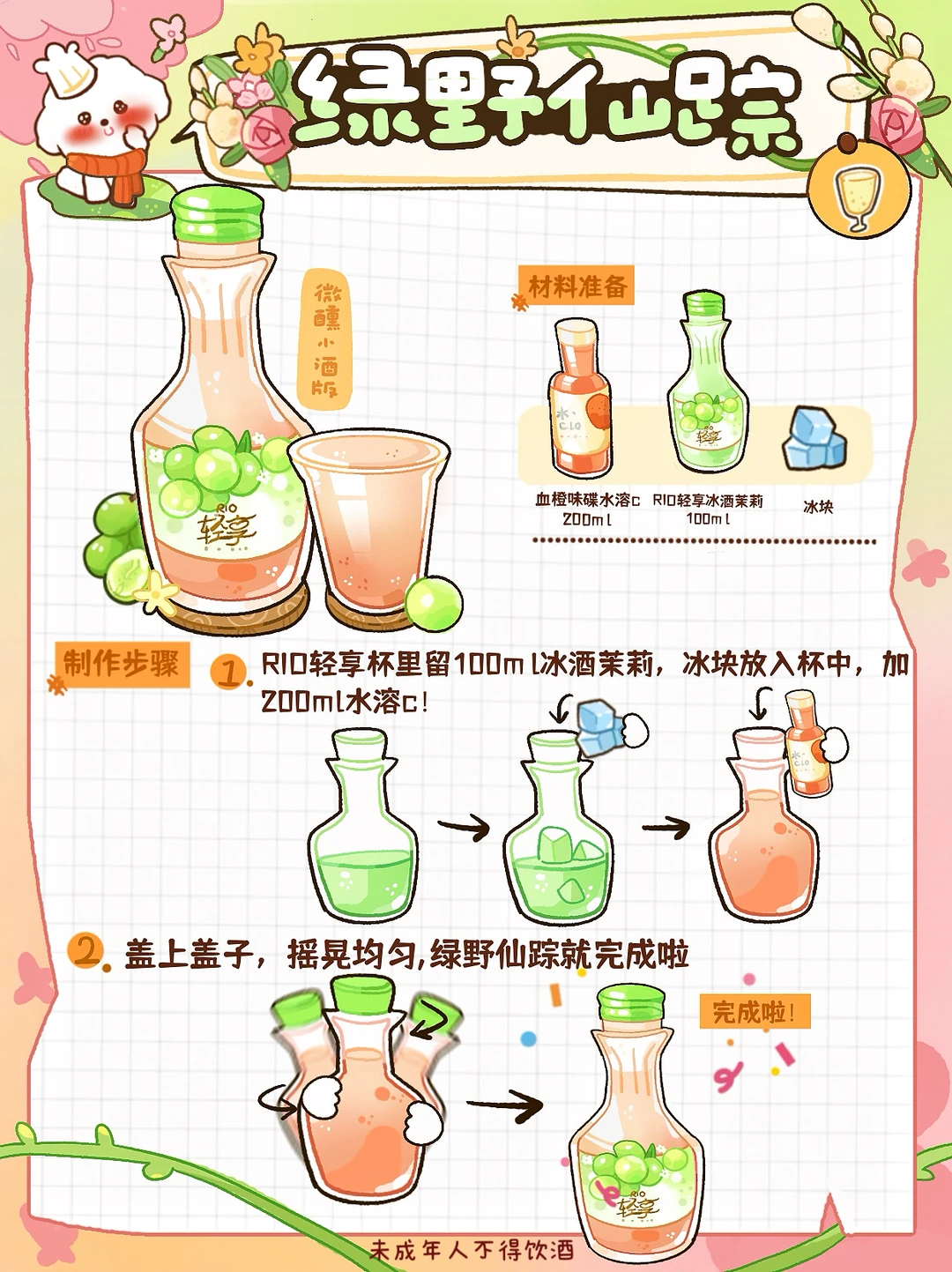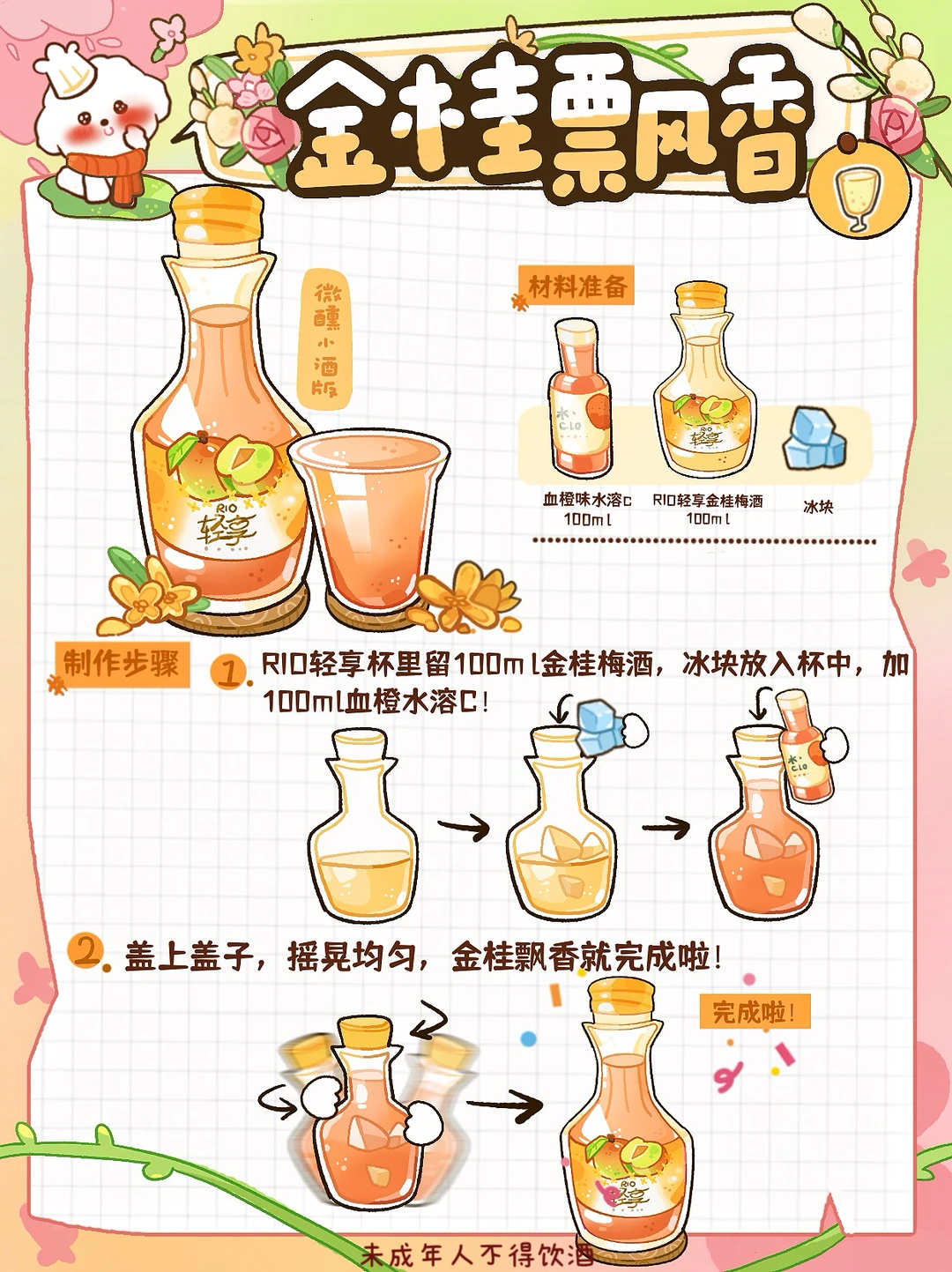 周末和闺蜜锁死这4️⃣杯 微醺时说的话比吃药还治愈😭 把焦虑喝进风里~ 🍺莓莓白桃(微醺版) ✨食材准备 RIO轻享100ml白桃樱花➕100ml莓桃味全➕冰块🧊 🥣制作步骤 1️⃣首先将冰块放入杯中,加100ml莓桃味全 2️⃣盖上盖子,摇晃均匀,味全莓桃就完成啦 🍺金桂飘香(微醺版) ✨食材准备 RIO轻享100ml金桂梅酒➕100ml血橙味水溶c 🥣制作步骤 1️⃣首先将冰块放入杯中,加100ml血橙味道水溶c 2️⃣盖上盖子,摇晃均匀,水溶c血橙就完成啦 🍺桂花养乐多(微醺版) ✨食材准备 RIO轻享100ml金桂梅酒➕200ml养乐多 🥣制作步骤 1️⃣首先将冰块放入杯中,加100ml血橙味道水溶c 2️⃣盖上盖子,摇晃均匀,水溶c血橙就完成啦 🍺绿野仙踪(微醺版) ✨食材准备 RIO轻享100ml冰酒茉莉➕200ml水溶c➕冰块🧊 🥣制作步骤 1️⃣首先将冰块放入杯中,加200ml水溶c 2️⃣盖上盖子,摇晃均匀,绿野仙踪就完成啦 ⭐️万能调酒搭配大师--RIO轻享 里面加了≥10%的真实果汁,有三个口味,我推荐金桂梅酒味,香香的花味儿混着醇厚基酒,12度的酒精度调得刚刚好! 入口软乎乎的没一点刺激感嘻嘻🥳 喝到微醺也不呛喉,第二天醒来清清爽爽的,完全没负担,头也不会痛的!亲自和诡蜜测验!😜 我就是近压力太大了😮‍💨 拉上闺蜜边喝边唠,真的会好很多!!!!! 大家可以试试!超级解压!!!!! 最后希望大家天天开心🥳