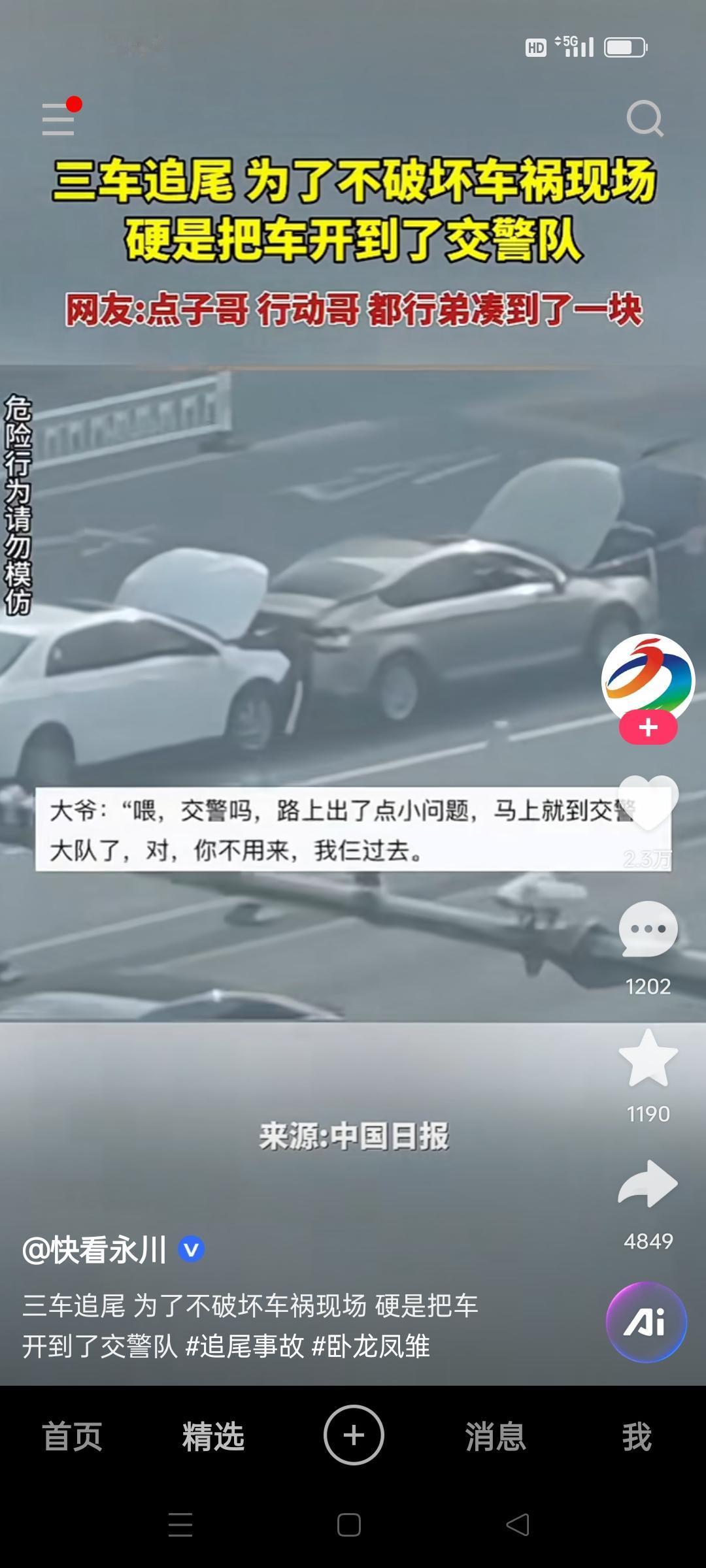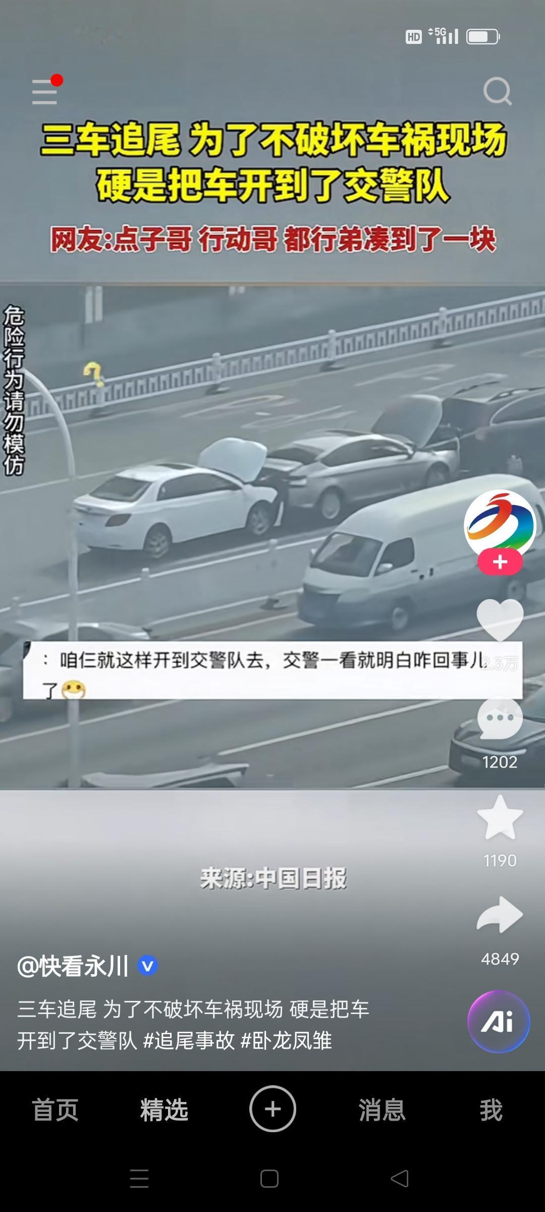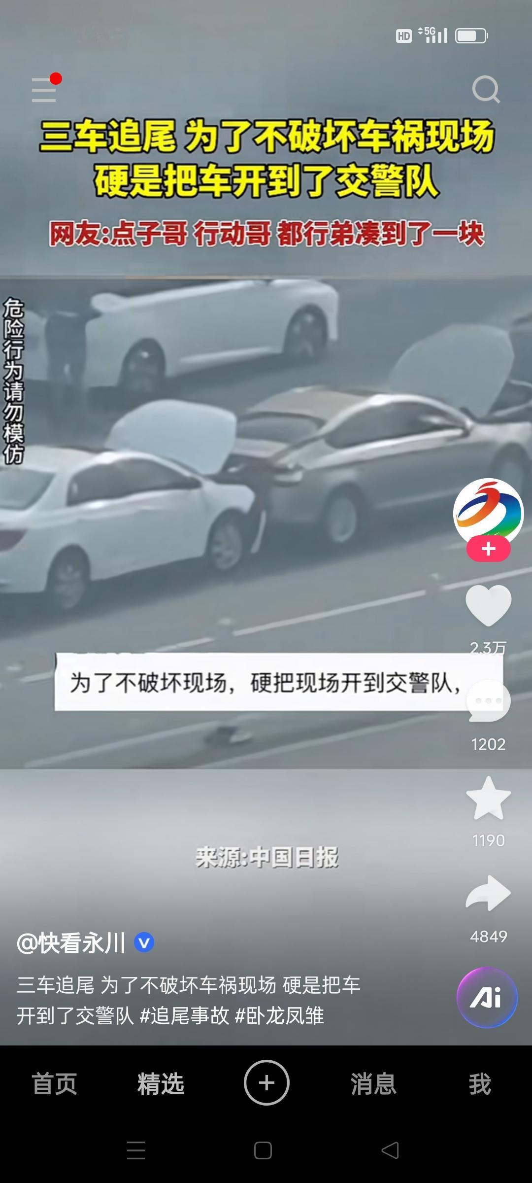 有卧龙的地方必有凤雏[捂脸][捂脸] 今天刷快手看到一个视频,天津三车连跑, 出了事故,都在原地等交警,天津不一样,追尾了,一起往前开,是为了保持现场完整吗? 我就想问一下,这要是开到交警队,会不会扣分!!![笑哭][笑哭][笑哭]