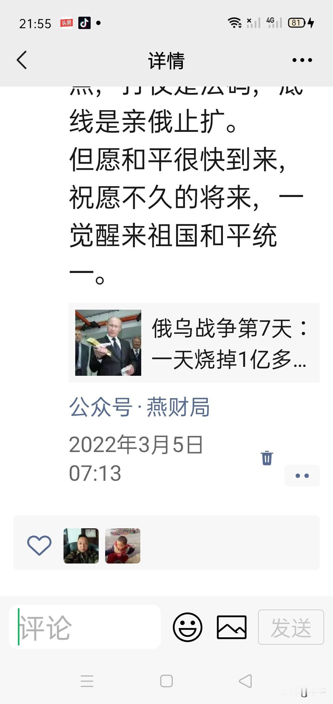 关于俄乌冲突系列(七) 这篇文章写于2022年3月5日。 俄乌俄划不作,赶快进入谈判桌,打起仗来即烧钱又惹祸,花的是国库和富人的钱,死的绝大多数是穷人,为什么深入推进,围而慢打,目的不是伤害,不是占领和吞并,从这些道义上可以看出,俄罗斯比美帝理性,俄罗斯那么大的国土,要乌克兰这个烫手的山芋有何用?要的是缓冲地带的和平与稳定、安全和正义。 估计不给他打疼还是有些不服,需要再拿下他三两个城市后,在谈判桌上才能乖点,打仗是法码,底线是亲俄止扩,祝愿和平谈判早日实现。