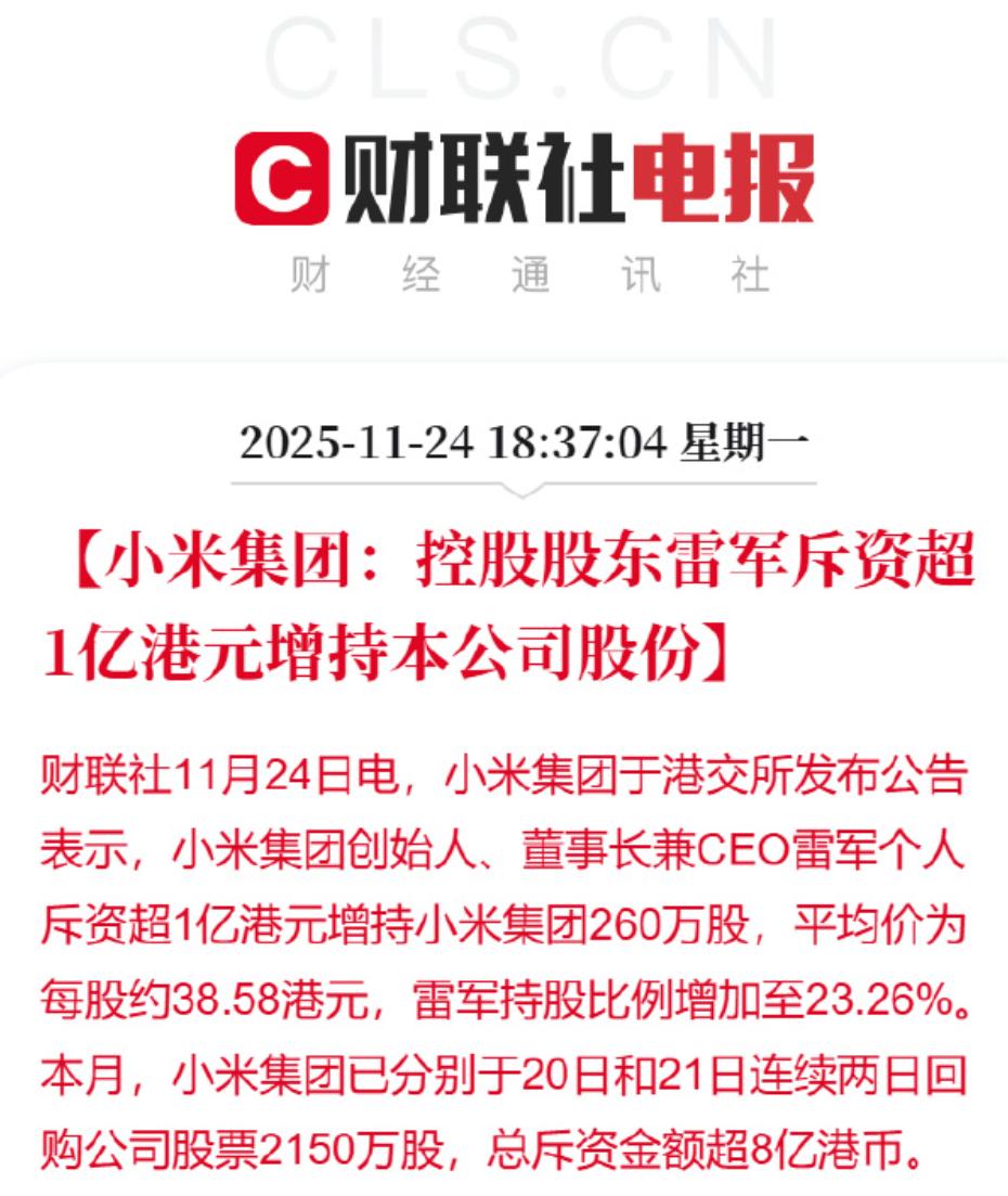 雷军斥资一个小目标增持小米,一举多得! 最近两周,新能源行业股市一片哀鸿,不仅是小米,几乎所有的上市企业都跌了20%以上。 小米更是被各种负面消息缠绕,从高点接近60,下跌到现在的不足40。 雷军在这个时间点增持,不仅能提升用户信心,对个人也是一个很好的投资决策。跟前段时间何小鹏增持效果一样。毕竟这个价位平时是很难买到的,未来大幅盈利几乎是板上钉钉的事。