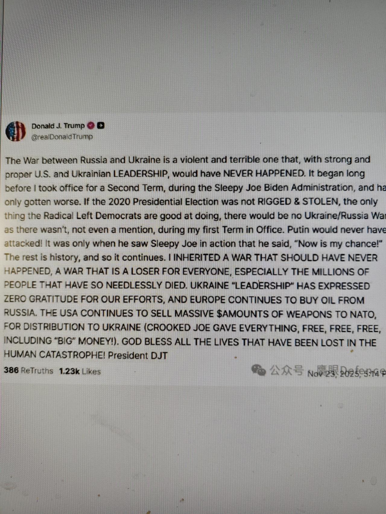 川普总统有点狼狈 刚才看到有人转发了老美总统川普的帖文。川普总统发表于昨天下午5点多,算是比较新的了。 使用翻译软件,简单翻译了一下,知道了川普总统帖文有三层意思。 其一如果美国和乌克兰领导层能够发挥强有力的正确领导作用,这场战争不会发生。 估计川普总统是想批评,乌克兰泽连斯基政府和当时的美国拜登政府“错误”领导,导致了俄乌战争的爆发。 到现在,川普总统还这样说,明显的有点无耻了。2022年,俄罗斯发动对乌克兰的特别军事行动,拜登政府已经多次警告俄罗斯,也多次提醒乌克兰,但是,这场战争是拜登政府和泽连斯基政府能够决定的吗? 除非,拜登政府一点不支持乌克兰,除非泽连斯基政府完全投降,泽连斯基总统直接逃跑到英国或波兰,建立流亡政府。 投降是如此简单,根本不需要“正确”或者错误领导,问题是,要是这样的话,乌克兰还能存在吗? 其二如果2020年总统选举没有被操纵或窃取,也就不会有俄乌战争。 2020年总统选举,川普败给拜登。这场选举是被操纵的,或者说选票被窃取了,这个问题川普如此认定,证据啦? 以他现在堂堂的总统之身,2020年总统选举要是真的有弊端的话,直接诉之司法就好了。不管咋说,老美的司法理论上依然是独立的。 对此类动摇老美选举公正性的问题,若有证据的话,根本不需要川普总统出面唠叨,司法系统肯定会搞定的。 如今川普总统说了半响,老美司法系统无动于衷,甚至老美国内也没有行动,显然,这不甘心2020年竞选失败的川普,纯粹是想当然了。 其三乌克兰“领导层”对我们的努力表示毫无感激之情,而欧洲仍在从俄罗斯买油。 乌克兰领导层,川普总统估计说的应该是乌克兰总统泽连斯基吧。他们怎么没有感激之情呢? 自从今年2月份,在白宫被川普总统“教训”之后,乌克兰各界,尤其是总统泽连斯基此后几乎每次公开讲话,都是感谢美国、感谢川普总统。 甚至,就在前几天媒体曝光了川普总统的28项和平计划,尽管乌克兰对该计划非常不满,极其憋屈,但是,包括泽连斯基总统在内,都没有公开反对。 说实话,对这样的出卖乌克兰利益,偏袒战争发起者俄罗斯,而老美赚尽经济利益的和平计划,欧洲以及西方国家是坚决反对,甚至如今的川普也承认,这不是最终方案。 要知道,从今年川普总统正式上任以后,老美对乌克兰的援助就已经很有限了。就如老美威胁那样,停止出售武器弹药和情报信息分享。也就是说,武器弹药是出售的,重点是情报信息分享。 乌克兰“领导层”能够组成很正式的团队,与老美国务卿卢比奥等,进行正式沟通,已经是退而求其次了。有个消息说,现在参加谈判的乌克兰前国防部长憋屈得将“铅笔”折断了。 此时的老美川普总统,说实话处于非常狼狈的境地。他指望着俄乌战争的结束,能够给他“加分”,摆脱目前所遇到的困难。 11月初,老美国内数个州竞选,共和党全部失败,包括纽约州在内都成了民主党人士的“地盘”。这让川普总统感受到了压力。 另外,来自是否公开爱波斯坦文件的事情,也让川普总统焦头烂额。与爱波斯坦熟悉,有长期交往,这是事实。而川普多大程度上参与,这才是致命的。 经过了重重博弈,如今川普总统咬咬牙签字决定公开。此时,有且只有川普总统内心清楚,需要什么样的“功绩”,才能抵消爱波斯坦文件的冲击。 到此,能够搞定俄乌战争,达成和平协议,不用说,绝对算得上是诺贝尔和平奖级别的成绩了。为此,川普总统只能“压服”乌克兰。 关键的是,乌克兰“领导层”会接受川普总统的和平计划吗?当然也包括俄罗斯会认可吗?呵呵,一切都是未知。