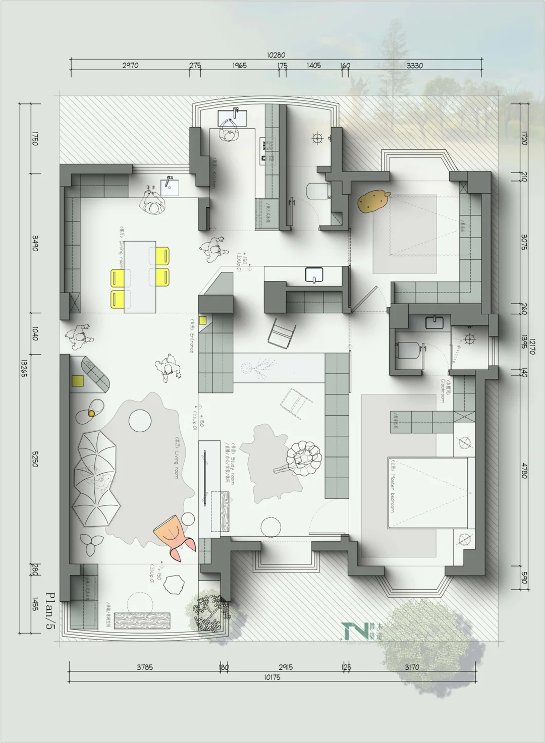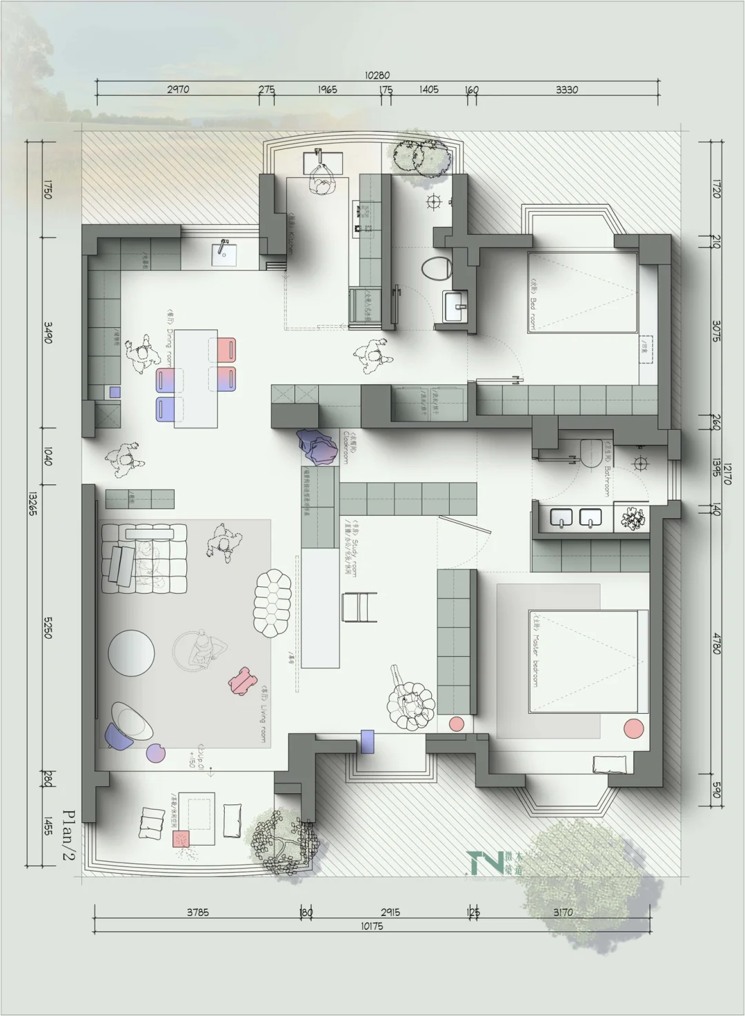 设计需求: 1、小姐姐买的第一套房子 2、需要一个主卧(带衣帽间)一个客房 3、一个书房(可以日常直播用) 4、大客厅 5、一个可以喝茶的地方 6、要衣柜尽量大(很多工作需要的衣服)