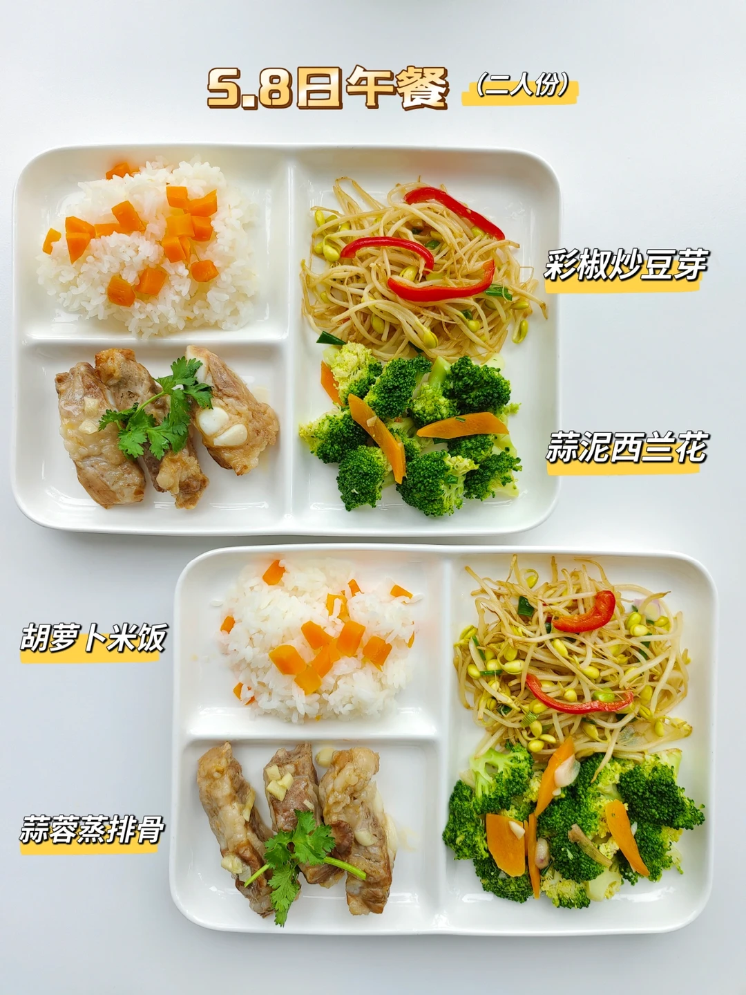 图片上两份餐食的是墨墨和妈妈每人一份,为了激励墨墨顺利减肥,妈妈和他一起减肥,一起分餐吃饭,一起做快乐的减肥搭子。