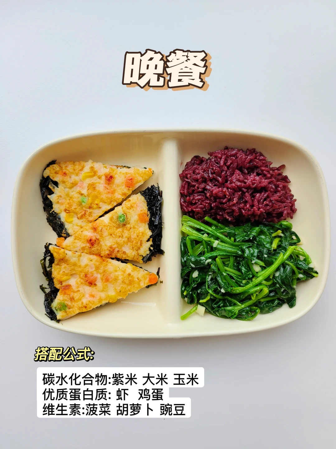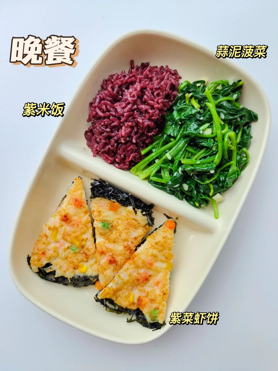 晚餐:紫菜虾饼➕紫米饭➕蒜泥菠菜