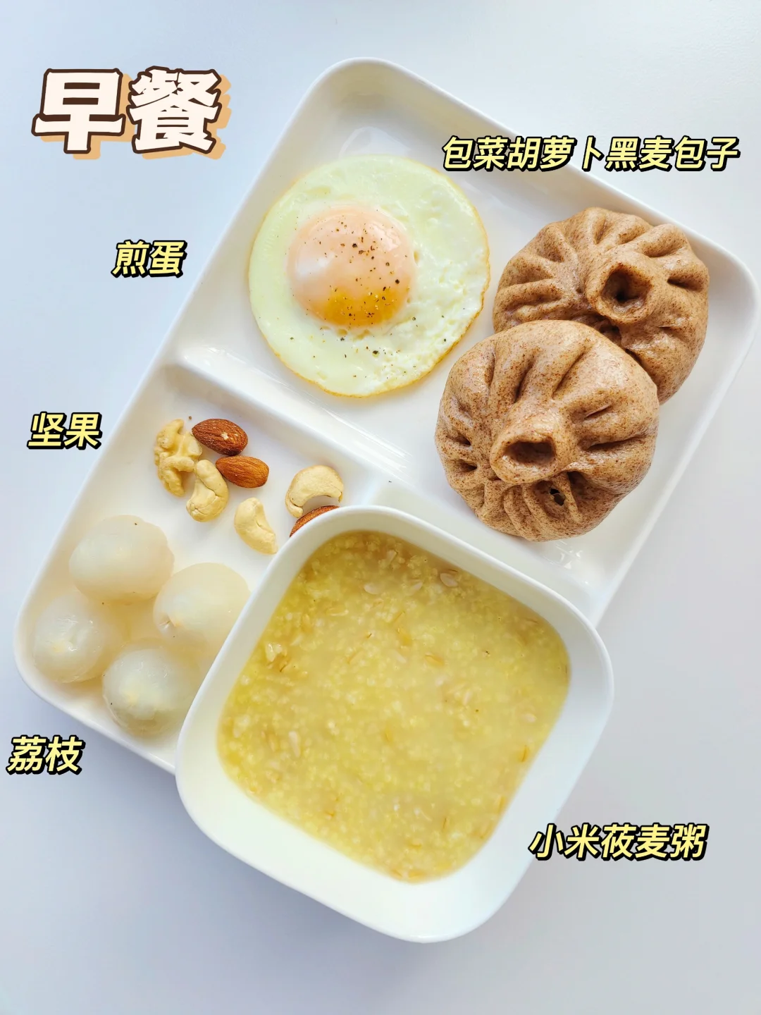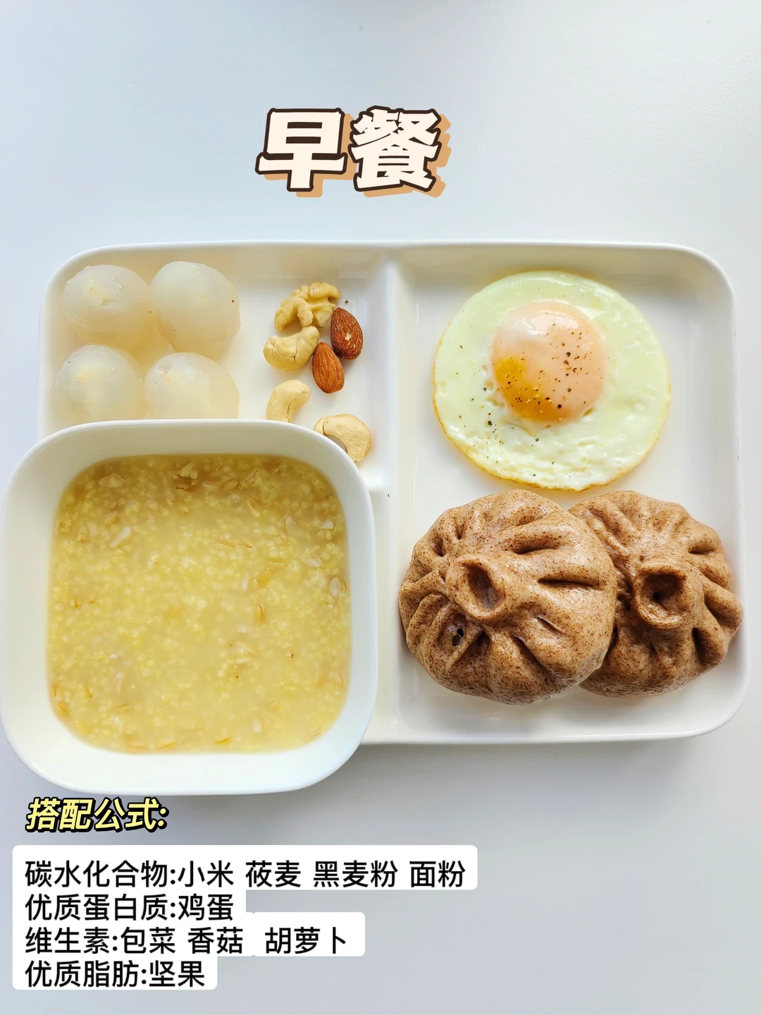 早餐:小米莜麦粥➕黑麦包子➕荔枝➕煎蛋➕坚果