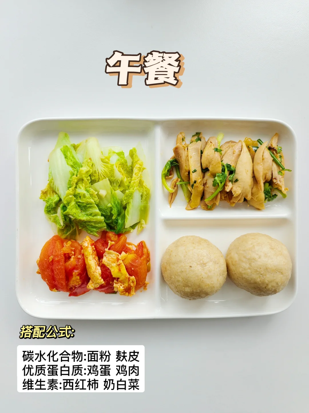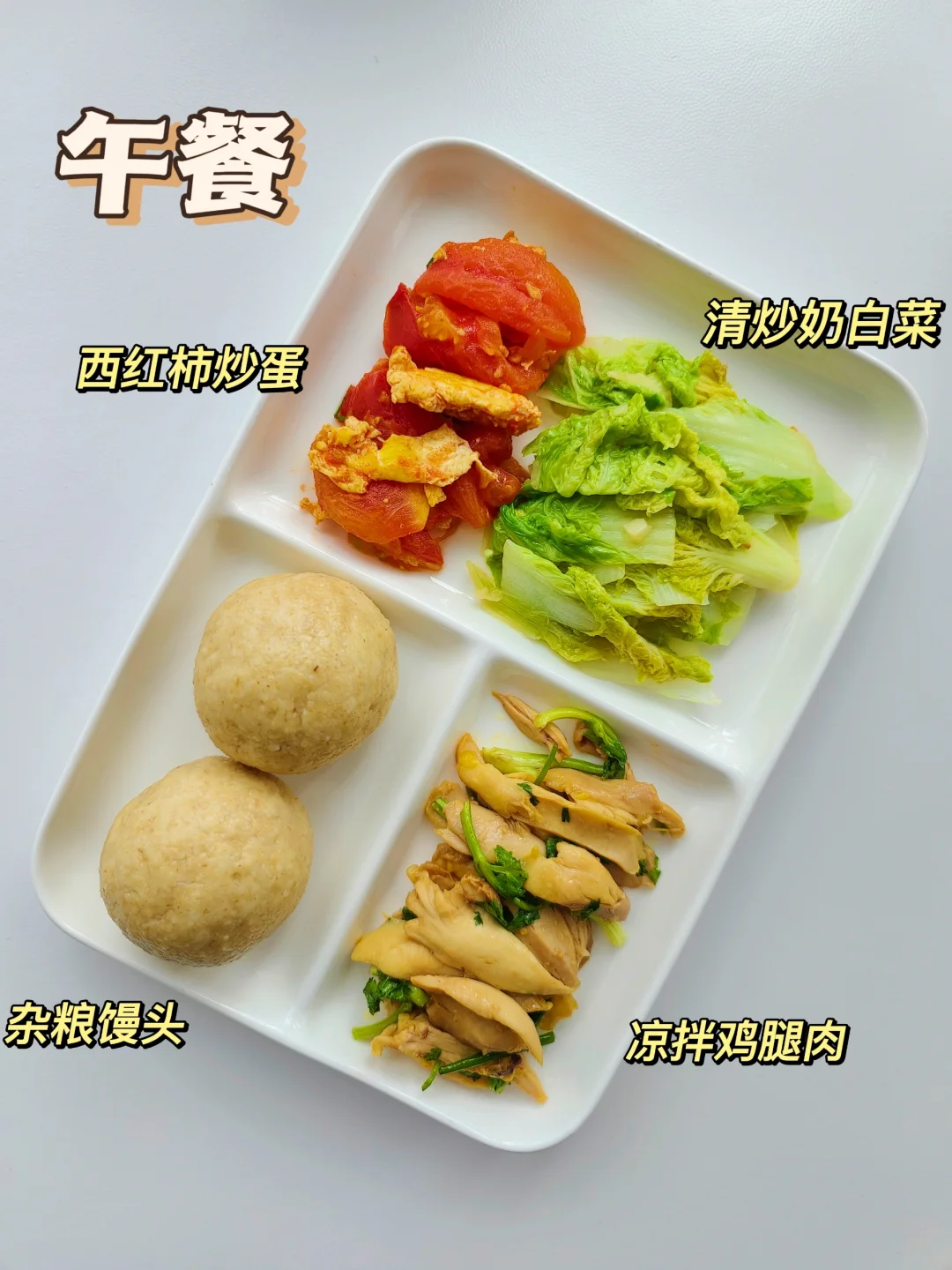 午餐:杂粮馒头➕凉拌鸡腿肉➕番茄炒蛋➕奶白菜