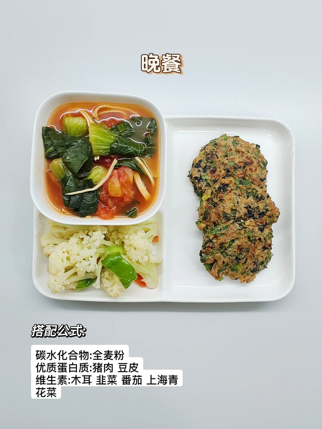 猪肉韭菜木耳全麦饼➕素炒花菜➕番茄豆皮蔬菜汤