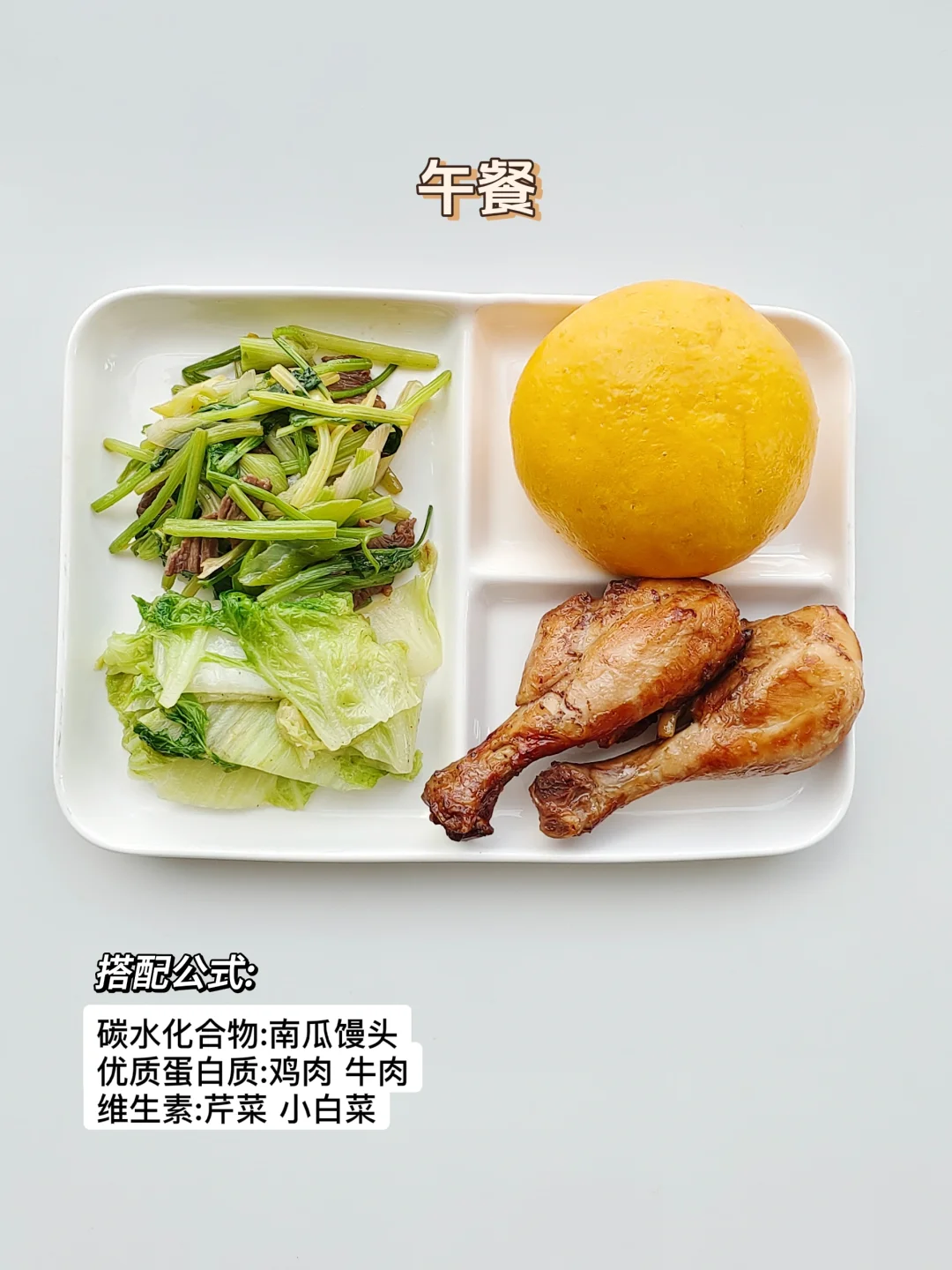 南瓜馒头➕烤鸡腿➕牛肉炒芹菜➕小白菜