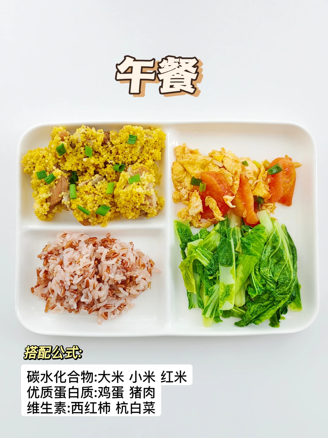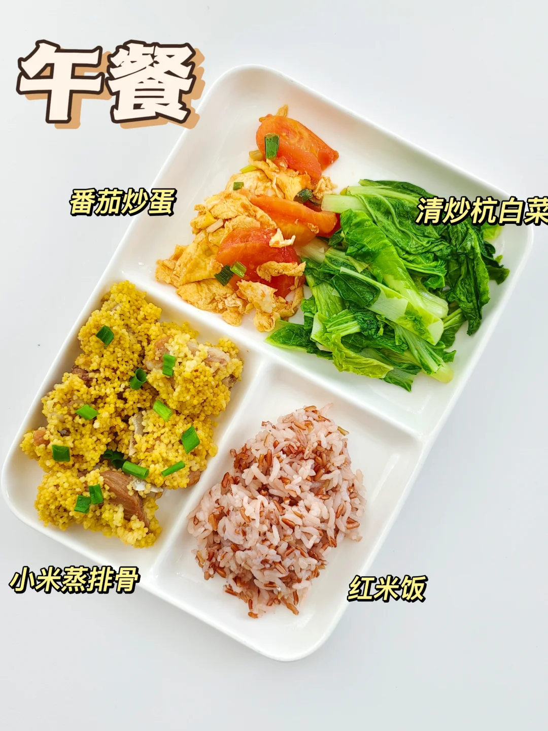午餐:红米饭➕小米蒸排骨➕番茄炒蛋➕杭白菜
