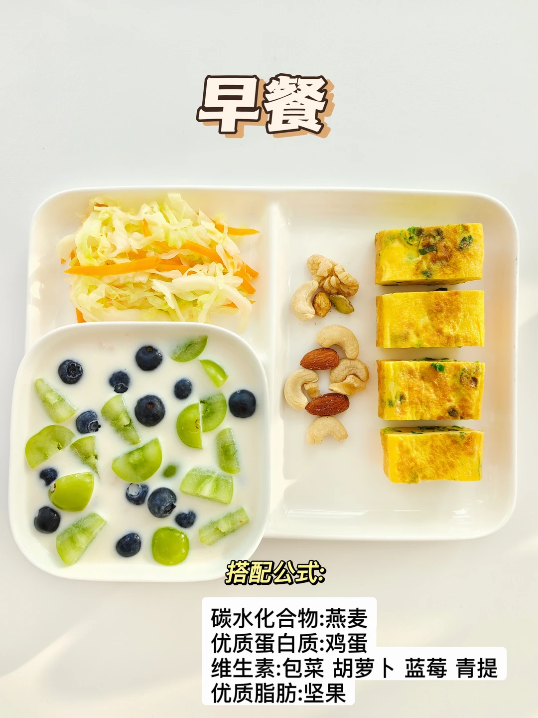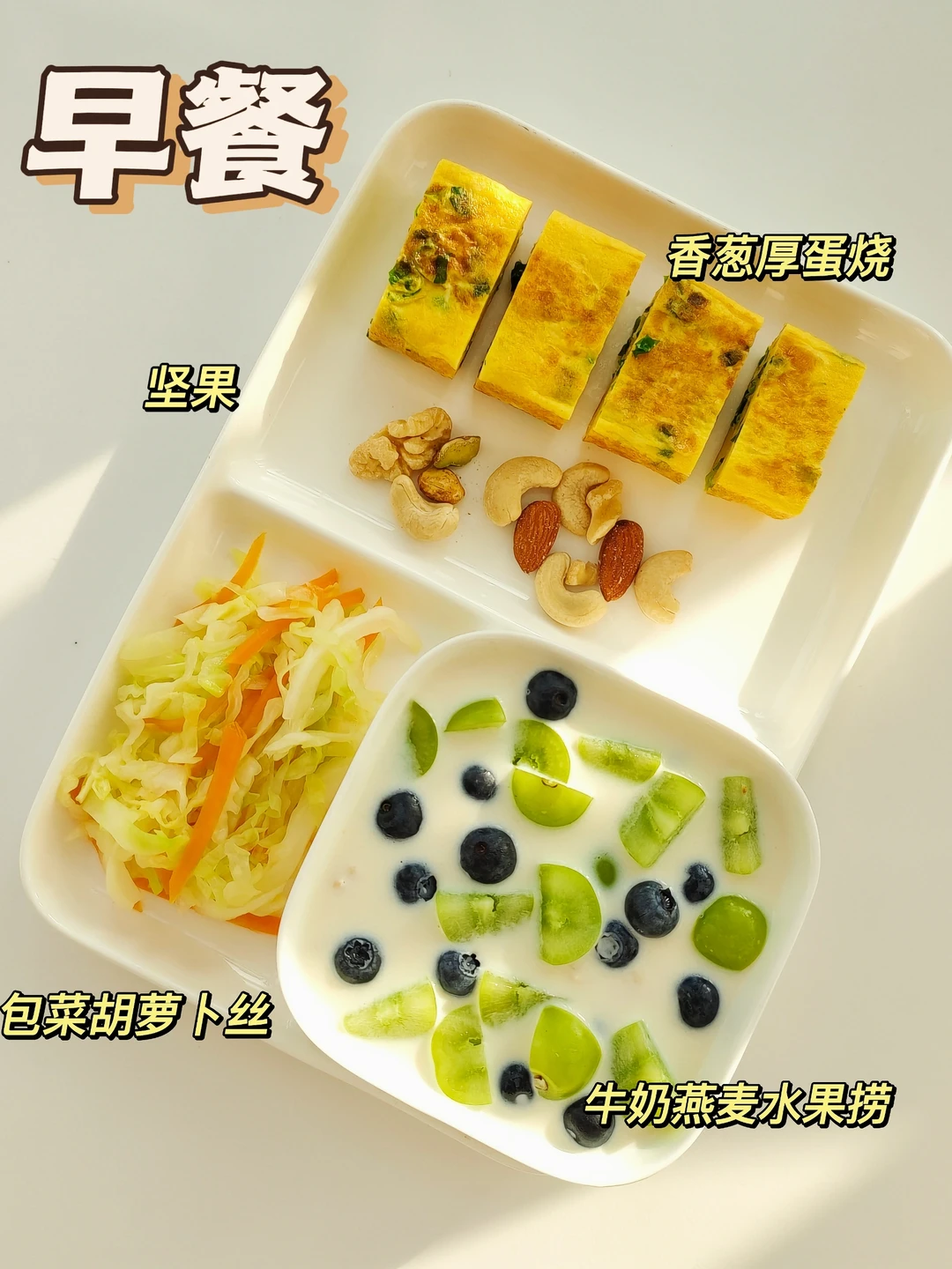 早餐:厚蛋烧➕牛奶燕麦水果捞➕清炒包菜➕坚果