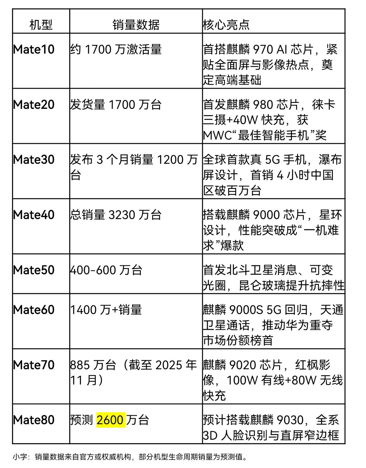 季后赛马上开打,不能免俗的,要预测一下能否夺冠:巅峰的Mate40系列销量曾达到恐怖的3230万台遥遥第一,预测Mate80系列销量可以拿到历史亚军,全周期2600万台没有任何问题。 Mate80系列预售已达到200万台,相当于第一节领先20分,开了个好头。 麒麟9030回归5nm的性能体验,没有理由再等,老Mate必退役,换机需求有增量。 鸿蒙6.0配合新版卓易通实现app自由,体验上升级明显,这板凳深度可以。 目前折叠机已经成气候,分流高端用户。Mate80在外形上没有新的亮眼设计,依旧星环。第四节风云突变,Mate40一波20分的小高潮反超比分,姜是老的辣,最终卫冕冠军。 下赛季夺冠的大热门是Mate90!各种黑科技和全新外观设计将会大杀特杀拿下总冠军。