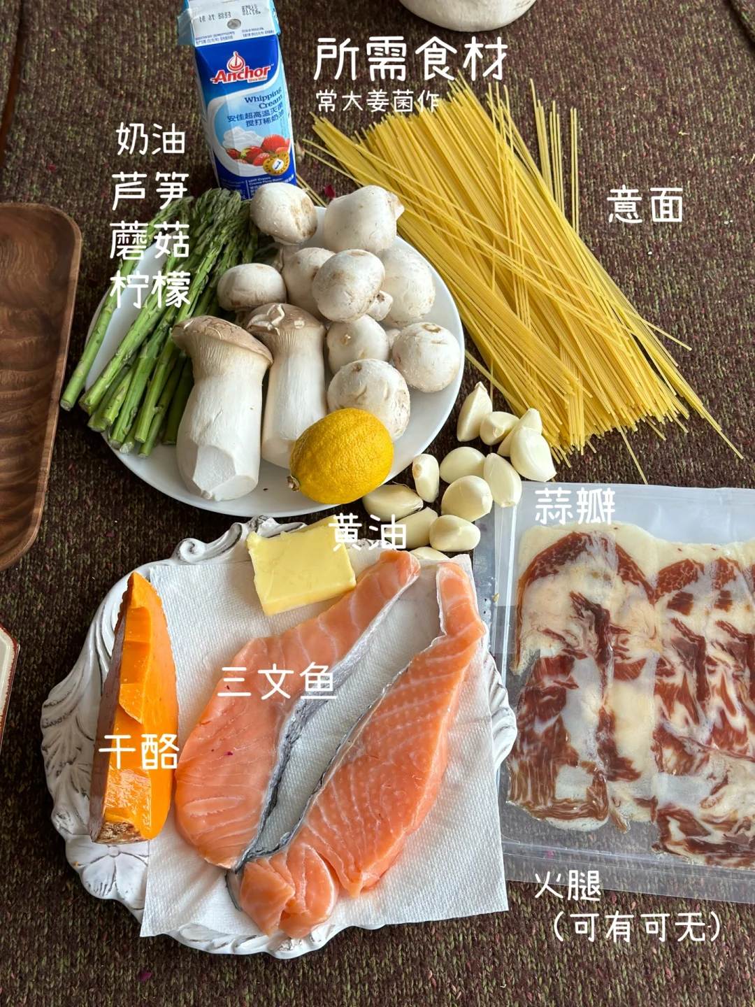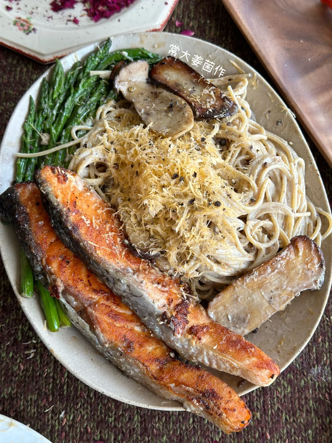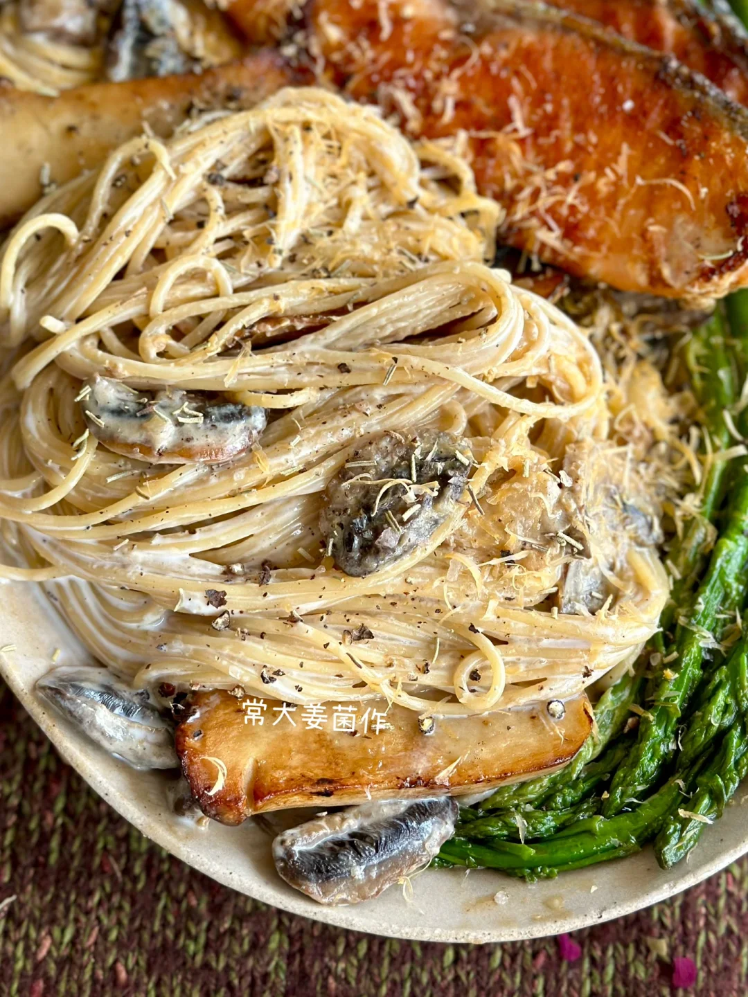 奶油蘑菇口味,虽然好吃,但难免会腻 🤓俺擦了点柠檬碎屑🍋简直决绝子! 清新感➕奶香厚重感,交相辉映~(属于是饱了还多吃两口的味道!嘿嘿嘿) --- 👨🏻🍳步骤 ①意面在盐水里煮3 | 2熟,冷水浸泡备用。 ②🐟三文鱼、🎍芦笋煎熟备用。 ③🧄蒜片爆香,同锅倒入🍄蘑菇煎至上色,🧈倒入黄油融化后,倒入🥛奶油和牛奶(或者肉汤),🍝意面倒入收汁,🧂黑胡椒盐调味。