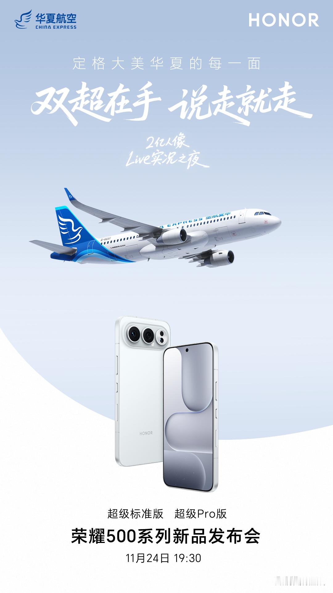 荣耀500系列居然还和航司一起搞活了 ,超级经济舱与超级标准版,重新组合了个新“双超”。2亿超清人像体验、8000mAh超大电池容量,这些荣耀500的全面越级使用体验,和航司舒适升级的舱位体验,确实挺match。