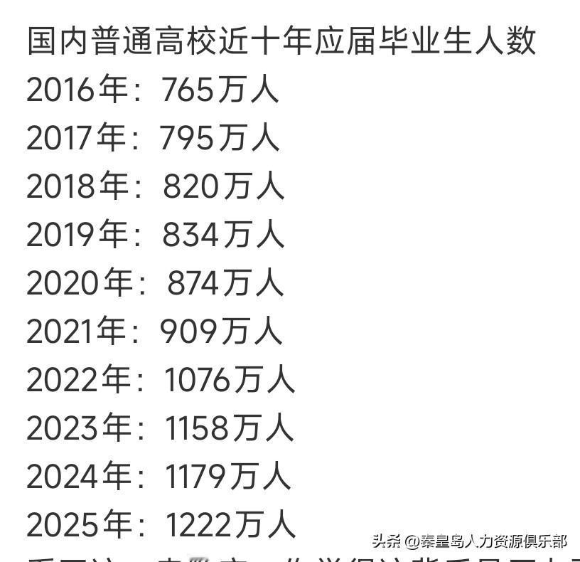 近十年国内高校应届毕业生人数从2016年的765万一路攀升,2022年首次突破千万大关,2025年已达1222万。十年间,毕业生规模几乎翻了一番,就业总量压力持续加大。 面对这串数字,压力是实实在在的。岗位竞争加剧,“慢就业”、择业“求稳”心态凸显。但危机中也孕育新机。新兴产业催生了AI、绿色经济等领域的大量新岗位;政策层面也在积极推动基层就业、创业扶持与技能提升。这意味着,求职者需要更主动地提升技能、转变观念,在变化的市场中寻找新定位。你是感觉压力更大,还是看到了更多机会?欢迎在评论区聊聊。