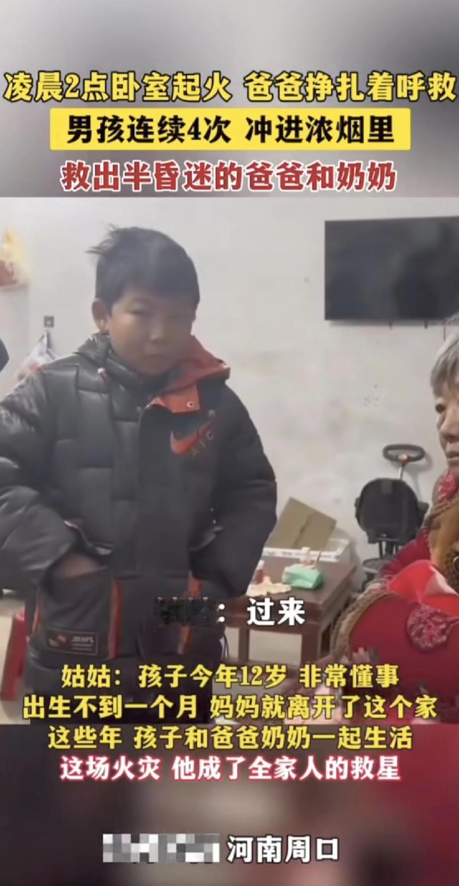 12岁男孩火海救家人,这个12岁的男孩,真是个小英雄! 凌晨两点家里突然起火,爸爸被困在浓烟里挣扎呼救。这个才12岁的孩子,竟然连续四次冲进火场,硬是把半昏迷的爸爸和奶奶都救了出来。 姑姑说起就心疼:孩子出生不到一个月妈妈就离开了,从小和爸爸奶奶相依为命。这场大火里,他成了全家的救星。 这么小的年纪,哪来这么大的勇气?姑姑叫他过来给他擦了擦脸上的灰问他“你害怕吗”孩子摇了摇头说:“不害怕!”这孩子比很多大人都要勇敢和冷静!