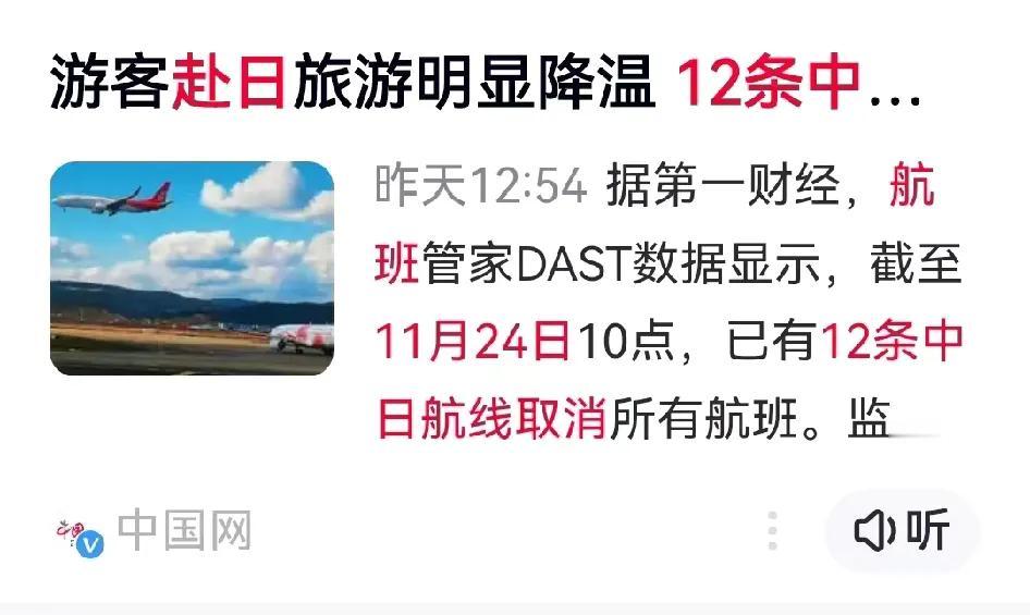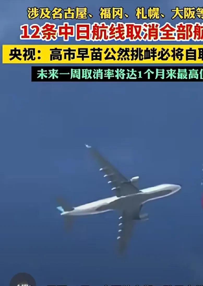 怎么看待12条中日航线全面停飞?有四大看点值得关注认知! 其一,11月24日,12条中日航线全面停飞,赴日航班取消率飙至月内峰值。起因是高市早苗发表涉台错误言论后毫无悔改,公然践踏国际法,还坚持“符合日本政府看法”。 其二,此举引发日本国内大乱,民众多次抗议,要求高市下台、道歉;经济上,旅游业等受重创,GDP或被拉低0.36%,损失达2.2万亿日元。政界也吵翻了,石破茂等批评其突破外交惯例。 其三,可高市依旧我行我素,日本还推进导弹部署演习等。她敢这么做,或指望美国撑腰,但美国口头承诺多,真出事了未必帮忙? 其四,中方立场明确,王毅外长强调日方应反省,否则后果严重。日本该醒醒了! 对此你怎么看?